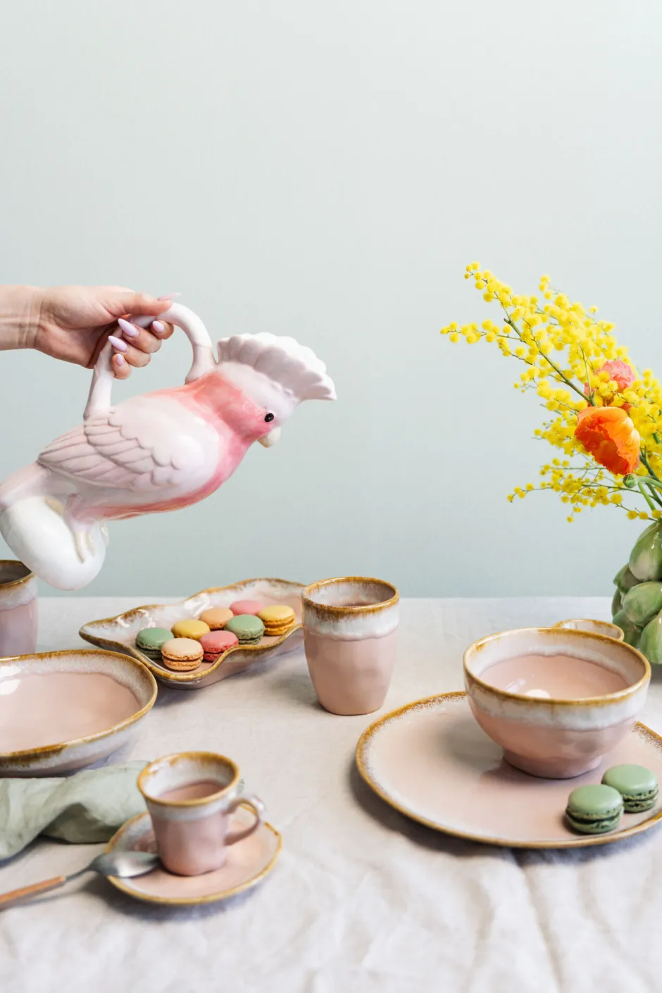 - Der zarte Rosa-Ton und sanfte Details in Weiß und warmem Beige schaffen einen harmonischen, mediterranen Look