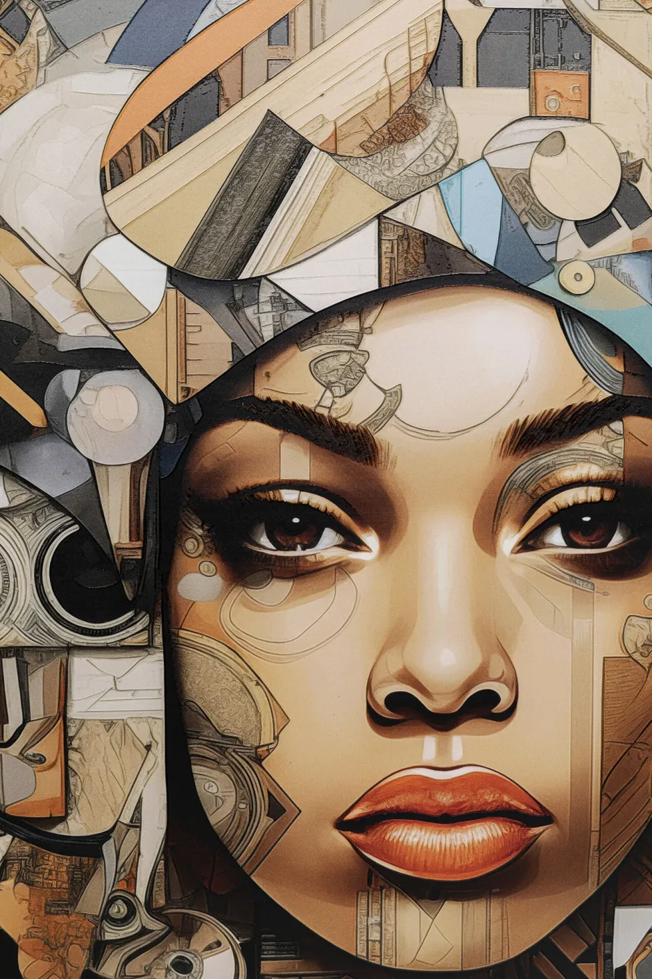 - Dieses Wandbild überzeugt mit seinem ausdrucksstarken Portrait-Motiv und abstrakten Formen in natürlichen Farben