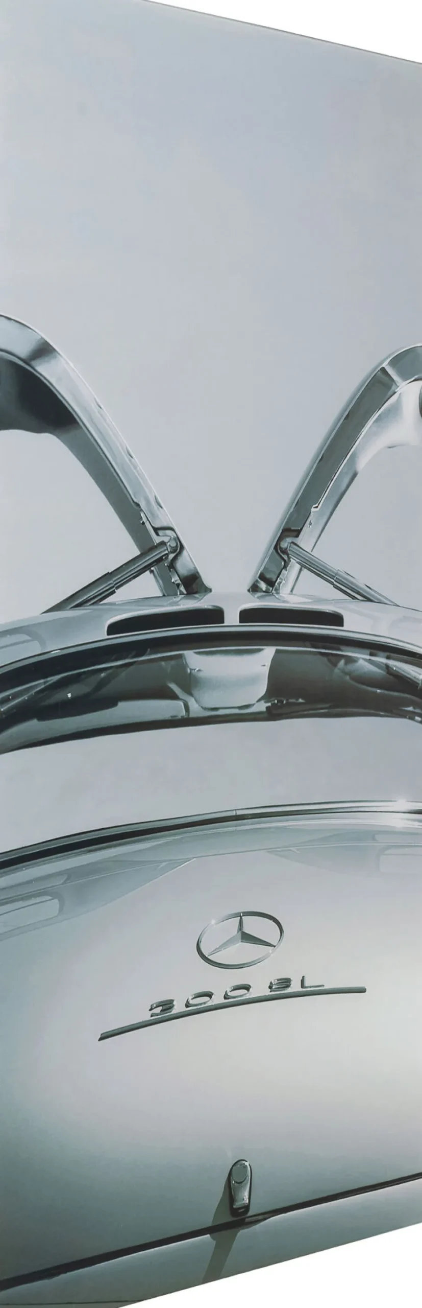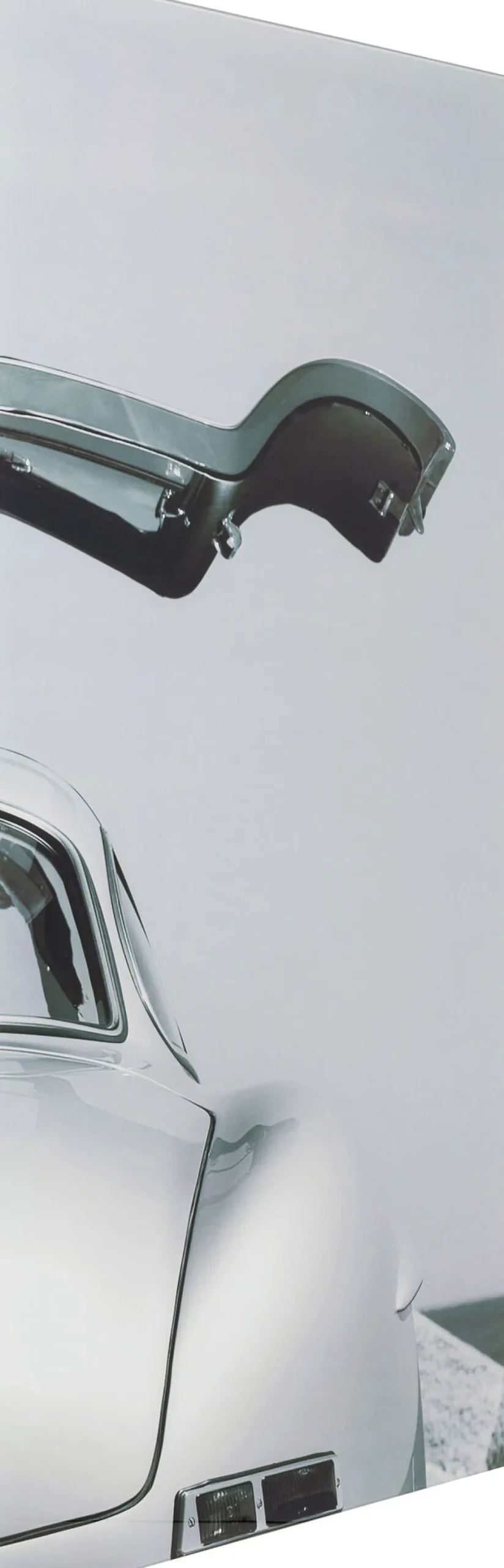 - Spektakuläres dreiteiliges Glasbild im XXL-Format mit der Heckansicht eines Mercedes-Oldtimers