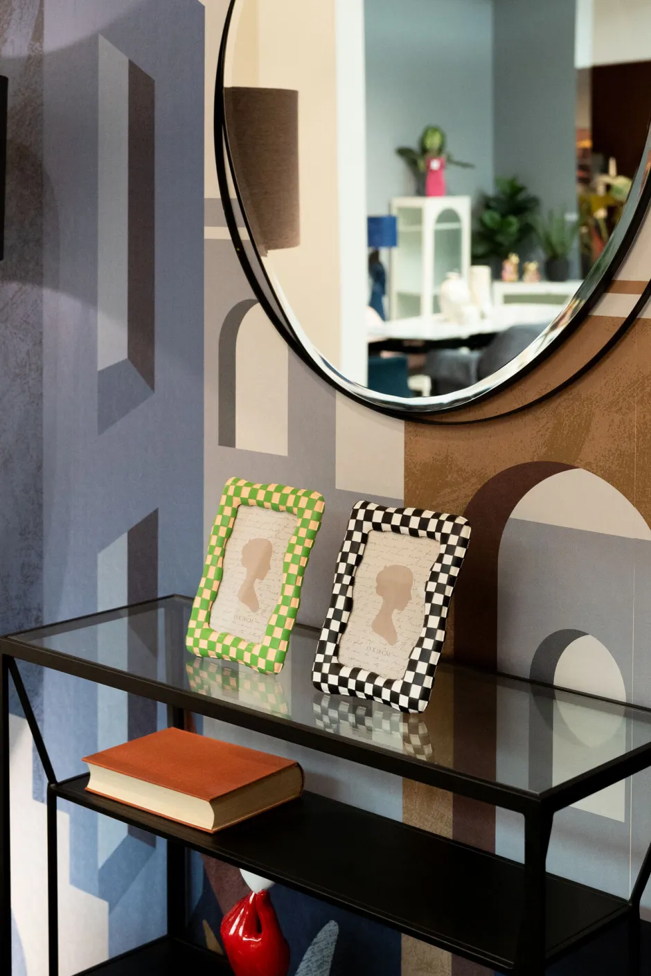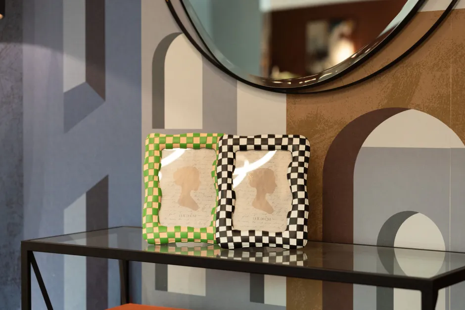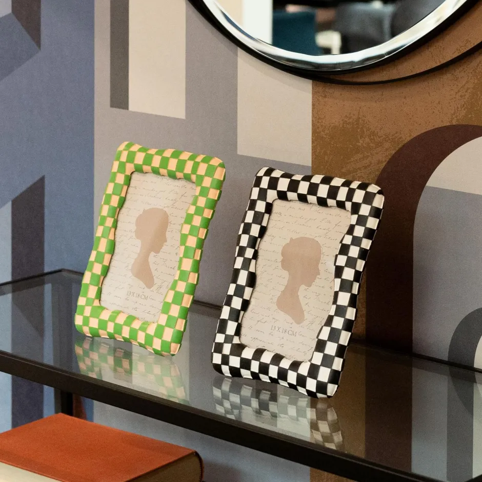 - Der Rahmen begeistert mit seiner dynamischen Form und klassischem Schachbrett-Muster