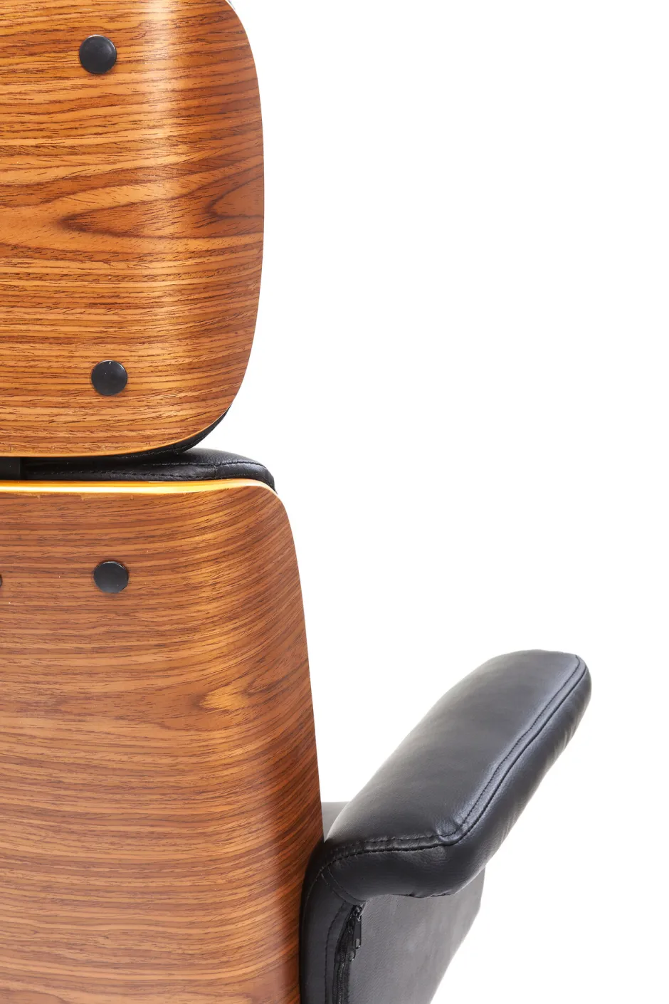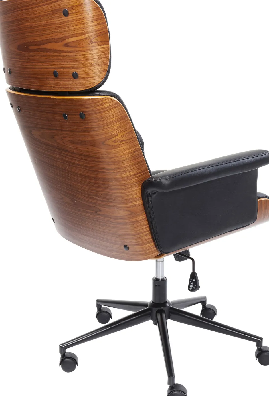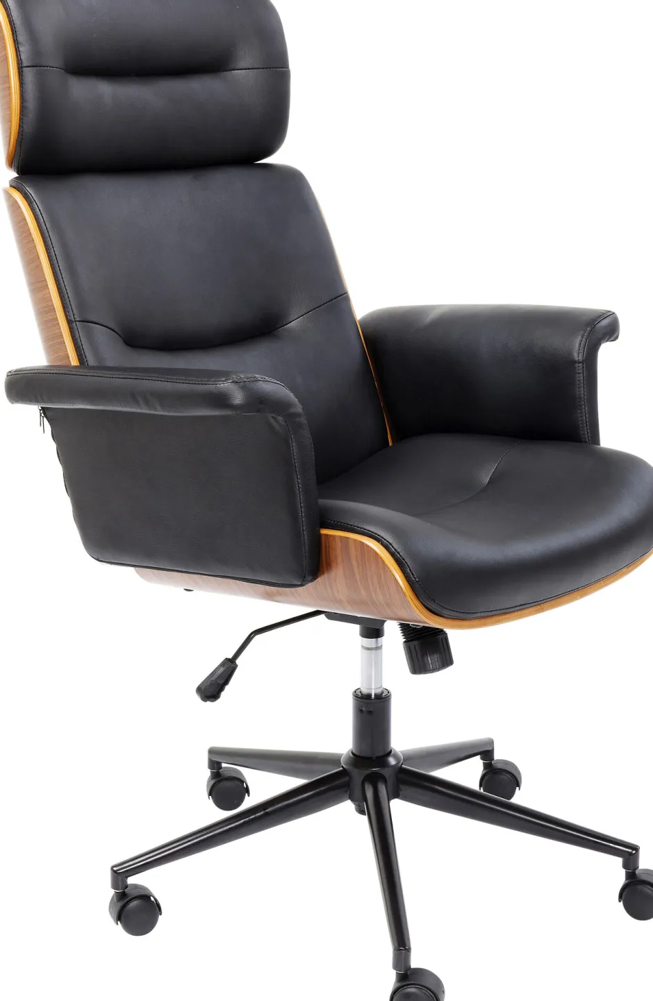 - Ausgesucht schöner Chefsessel: ein Bürodrehstuhl mit edler Furnierholzschale und bequemer Polsterung in schwarzer Lederoptik