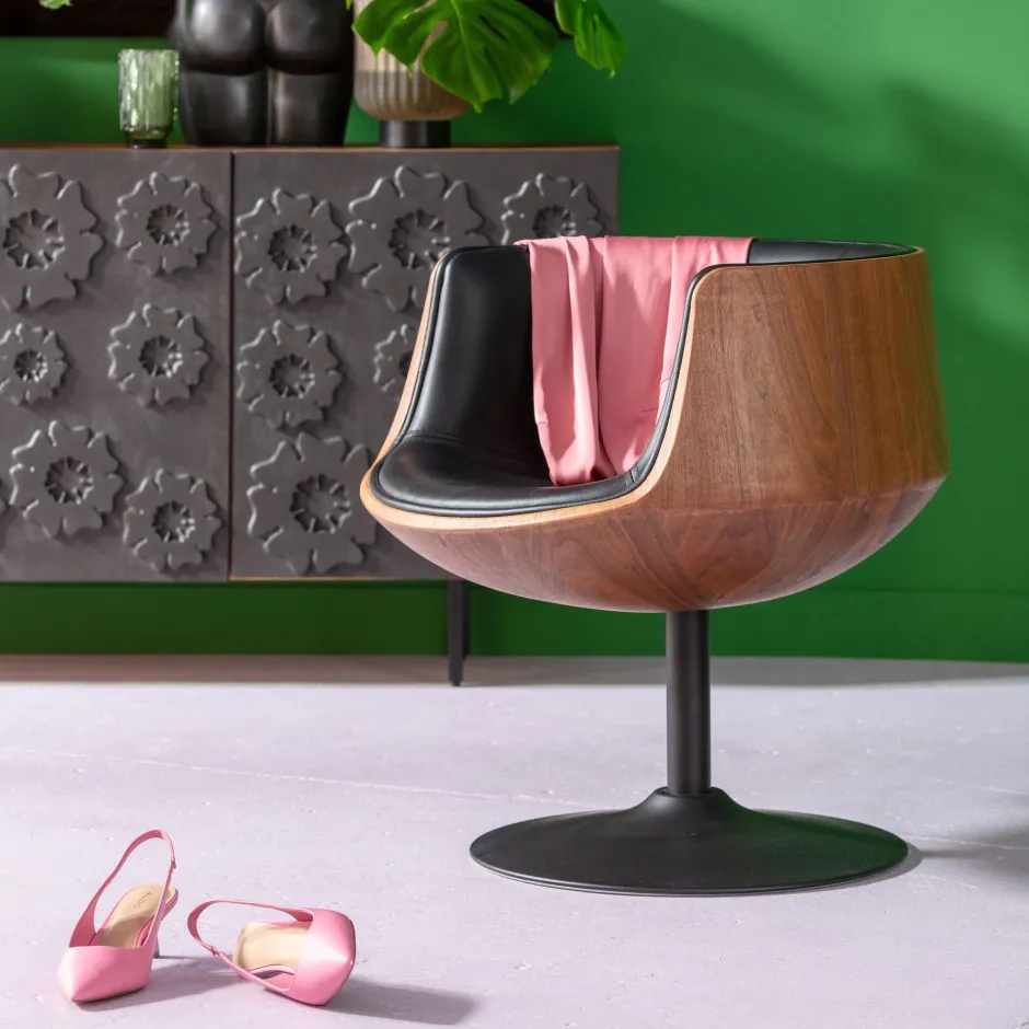 - Club-Drehsessel in schwarzer Lederoptik und mit einer Schale, die außen mit edlem Walnussfurnier versehen ist