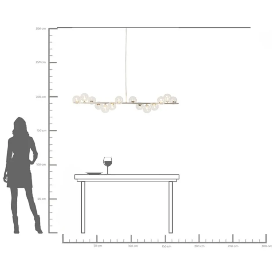 - Große, edle Hängeleuchte im Querformat mit einem silberfarbenen Gestell und 14 Leuchtenschirmen aus Glas