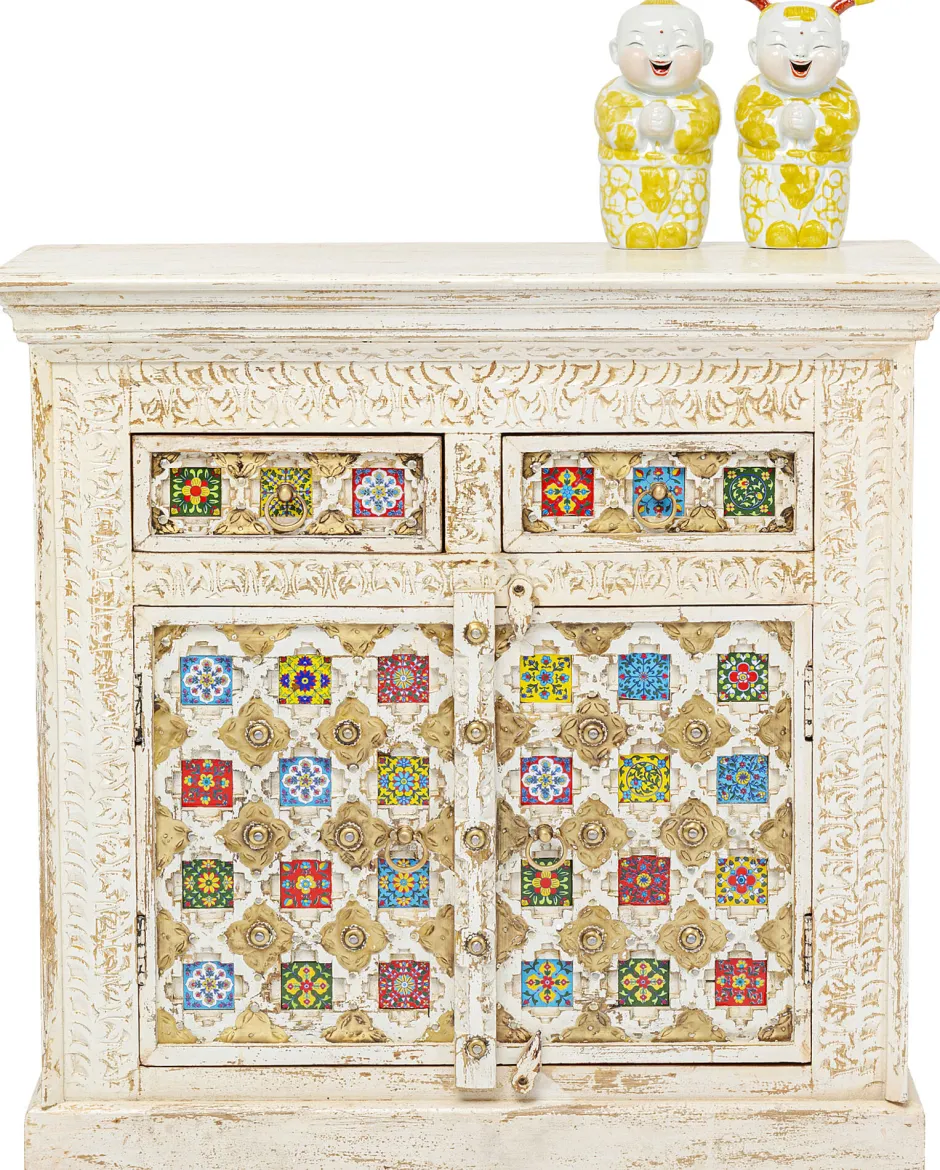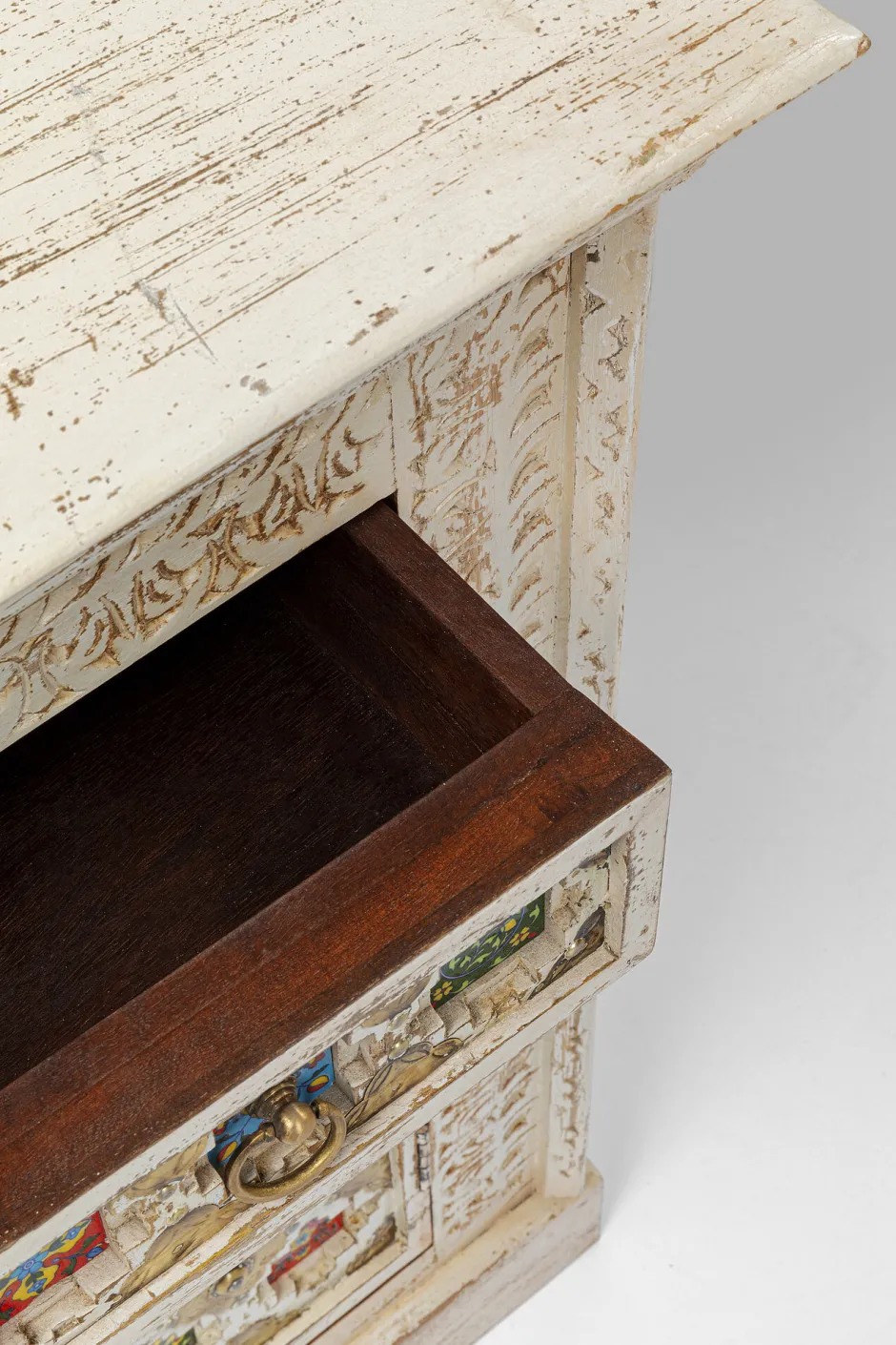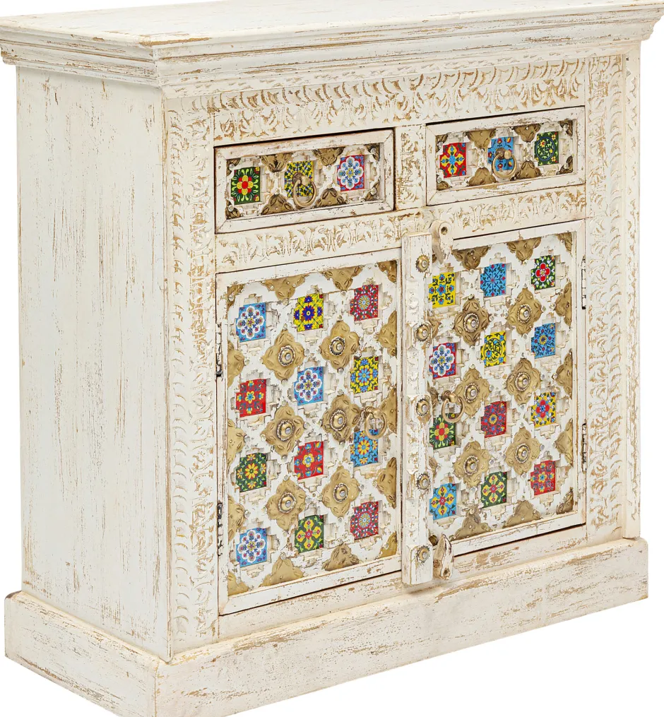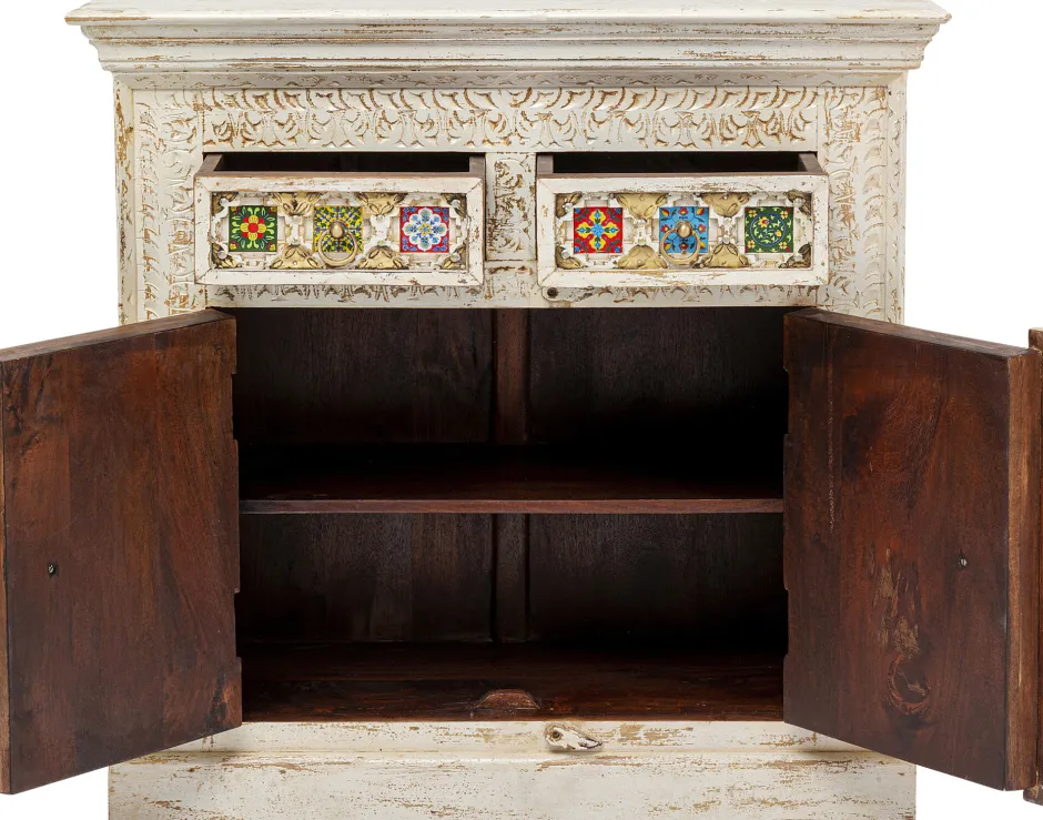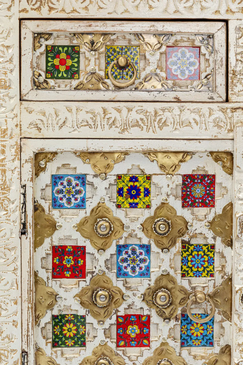 - Massivholz-Kommode mit aufwändigen Schnitzereien, messingfarbenen Metallverzierungen und bunt gemusterten Kacheln