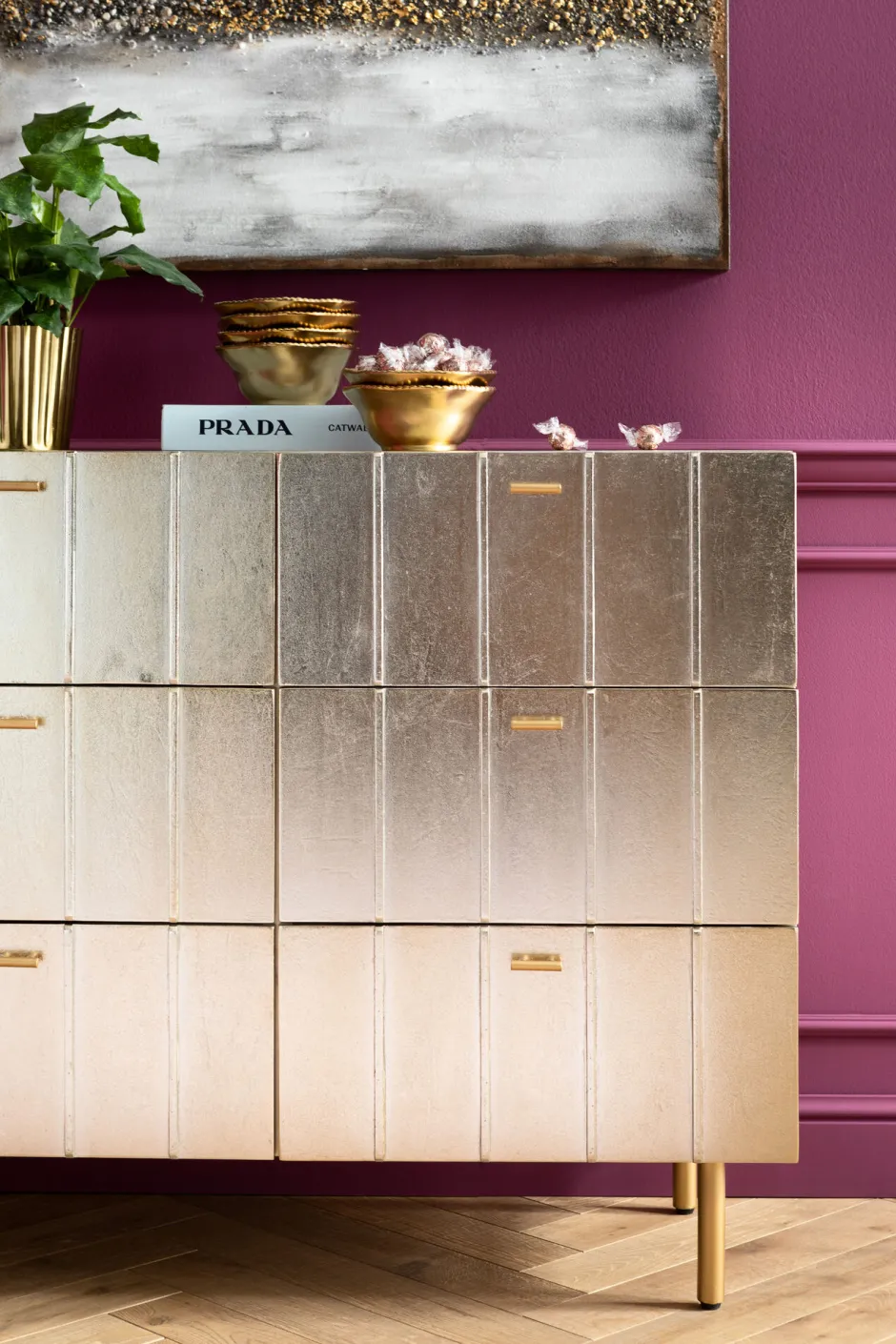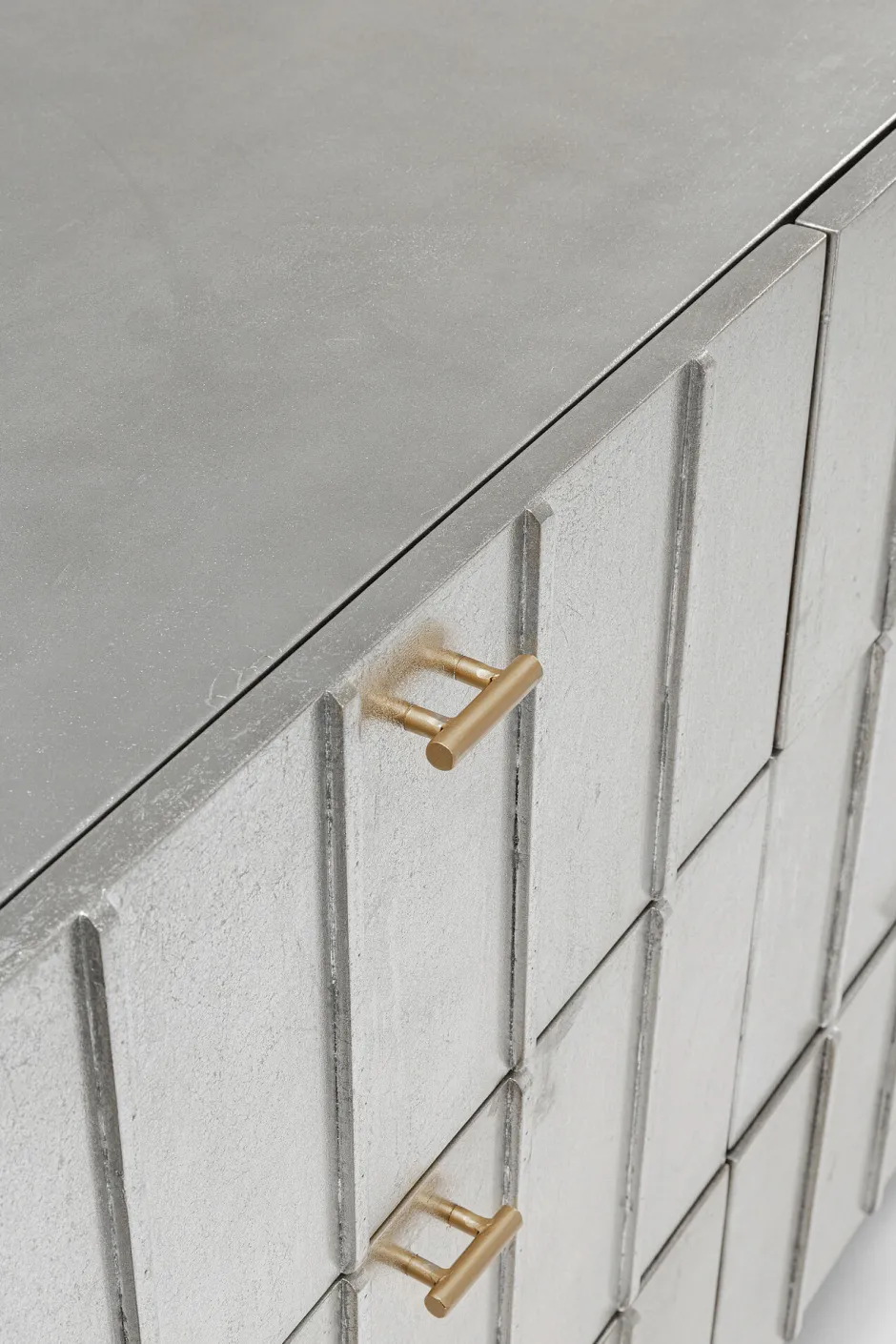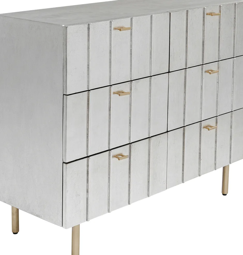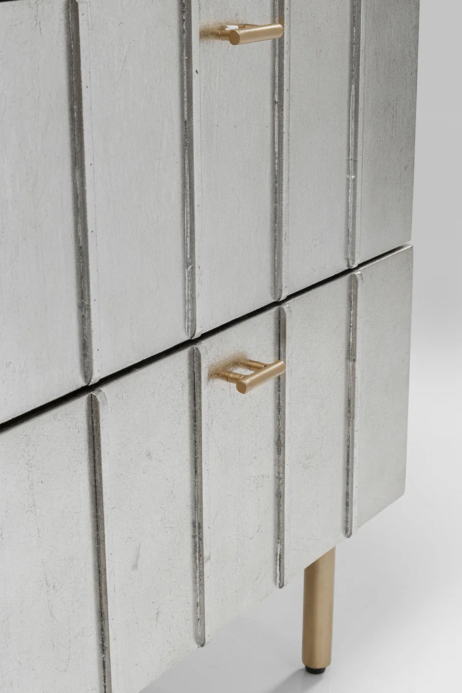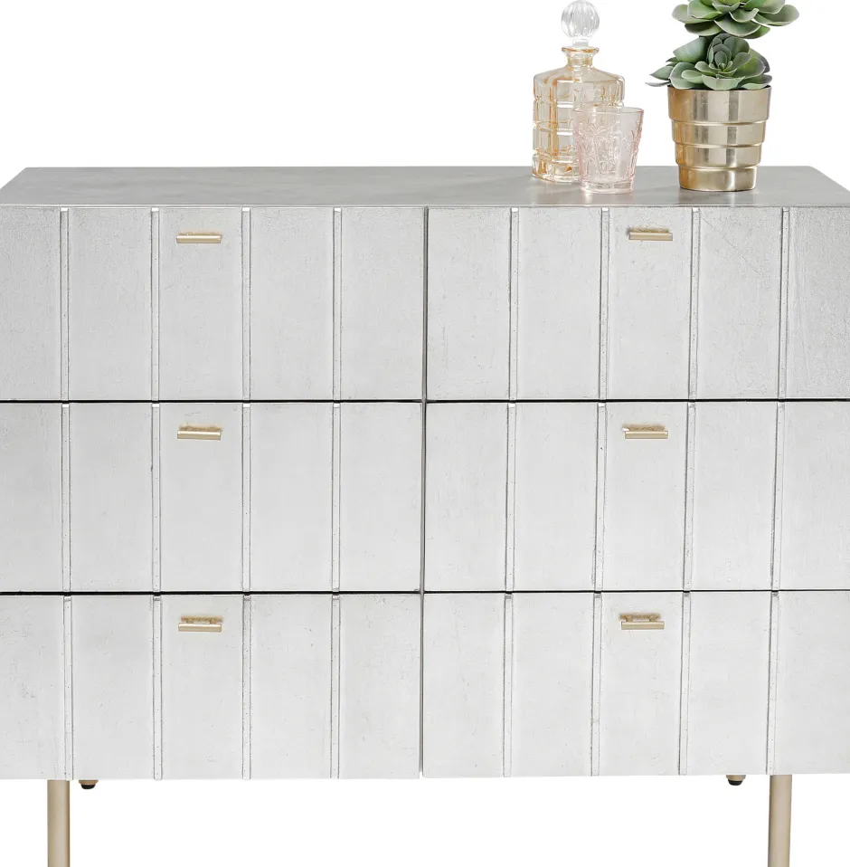 - Lackierte Schubladen-Kommode in Silber und Gold mit grafischem Frontdesign, 89 x 106 x 40 Zentimeter (H/B/T)