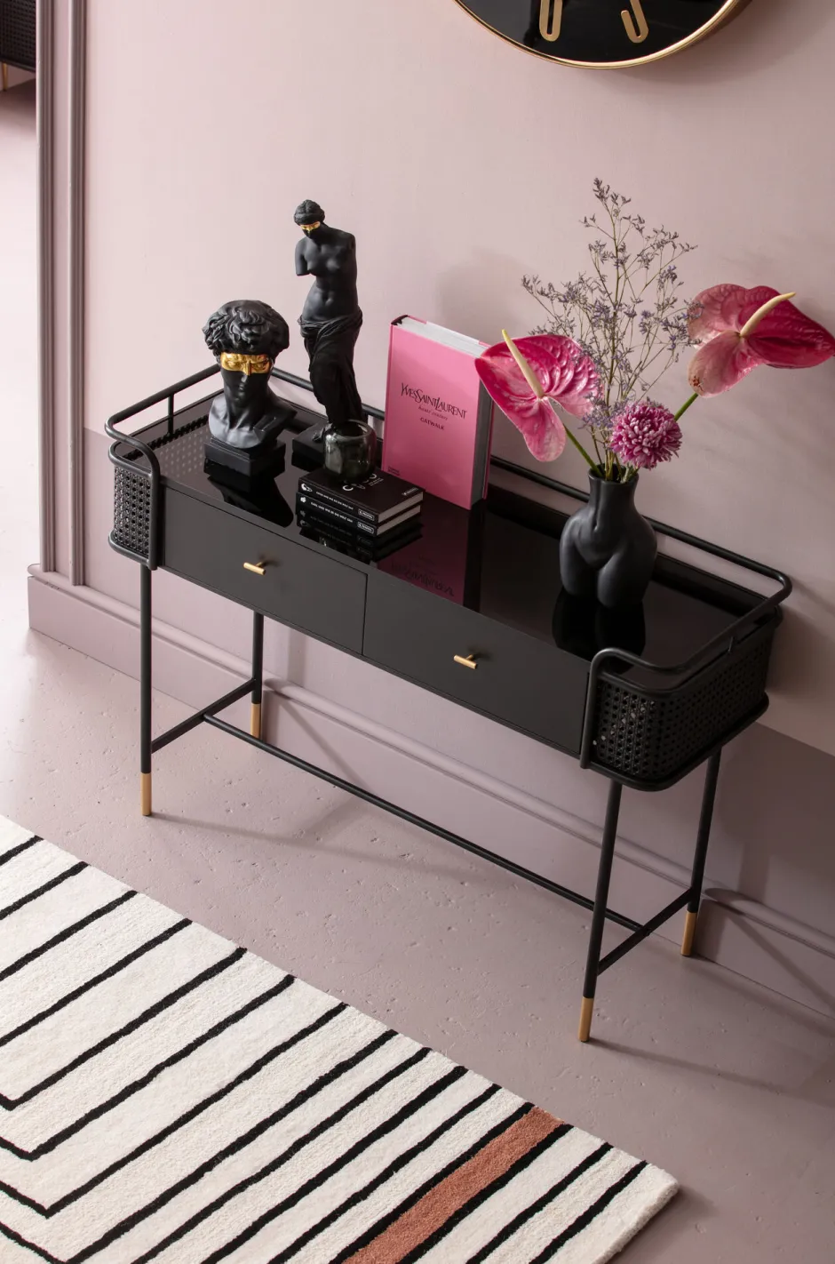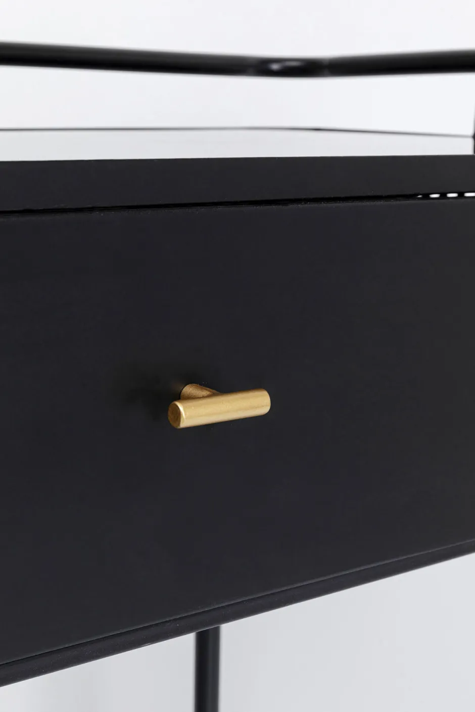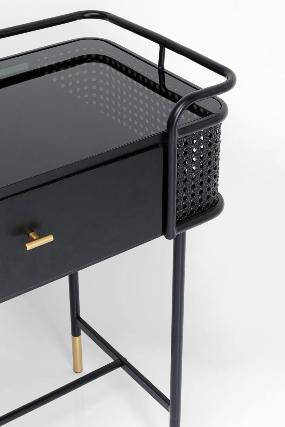 - Schwarze Konsole aus Metall mit Schubladen und einer Deckplatte aus gefärbtem Glas