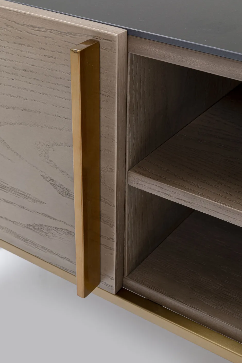 - Das TV-Board hat eine auffallend schöne Oberseite aus Keramik in Erdtönen. Griffe und Gestelle sind mit Messing veredelt