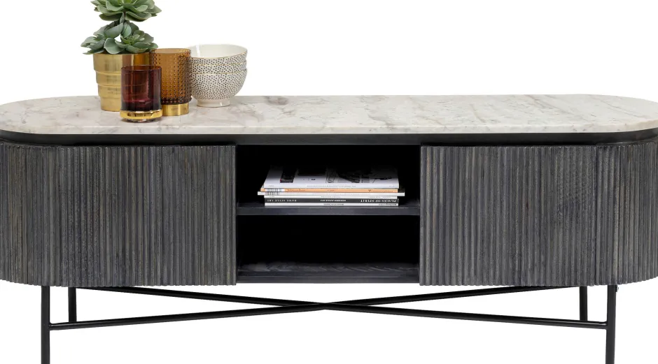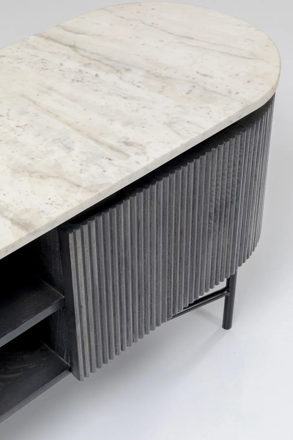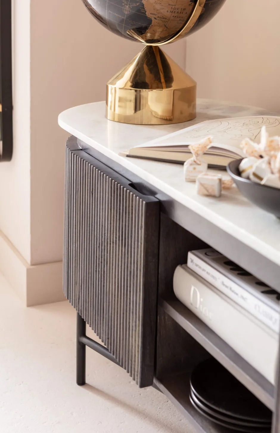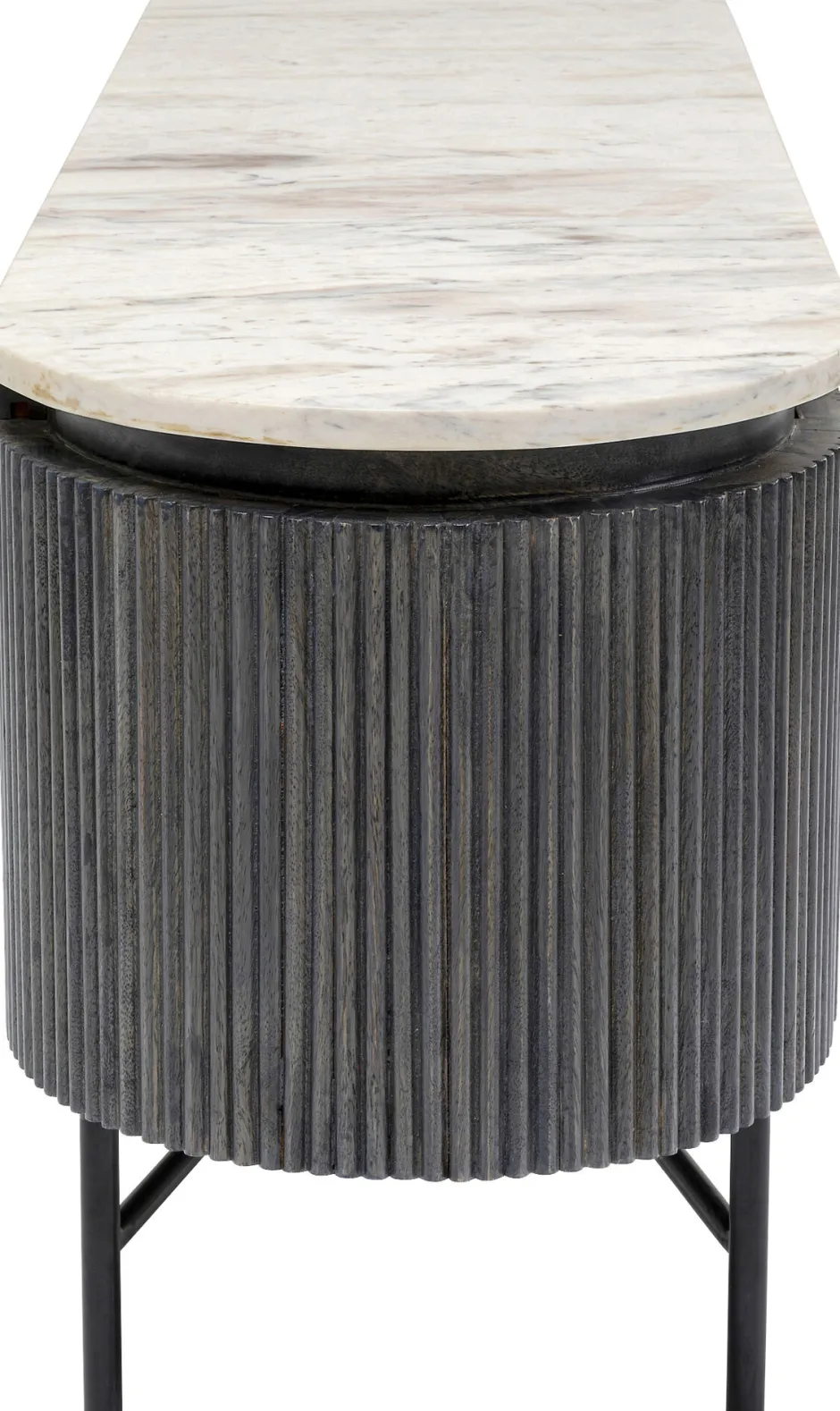 - Spielt mit dem Schwarz-Weiß-Kontrast: elegantes Sideboard mit heller Marmorplatte, dunkelgrauem Massivholz-Korpus auf filigranem Stahlgestell in Schwarz