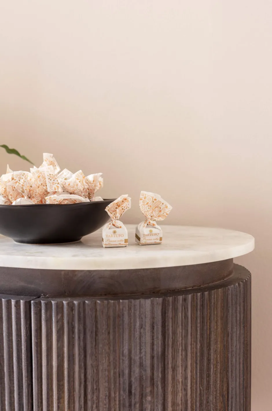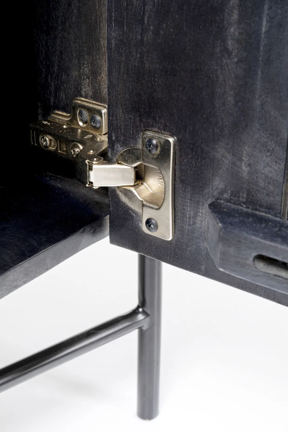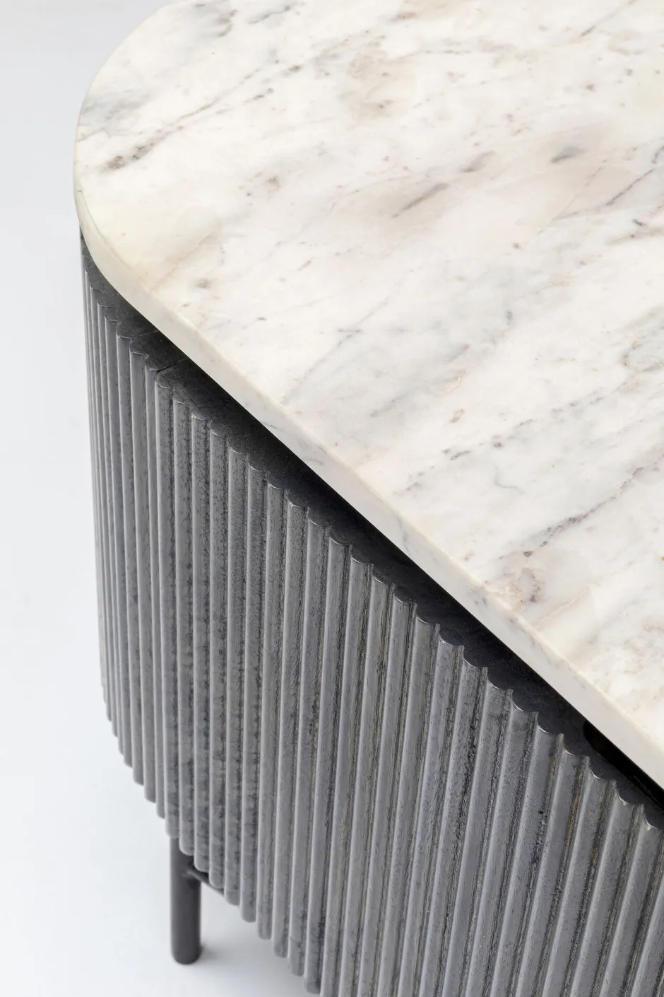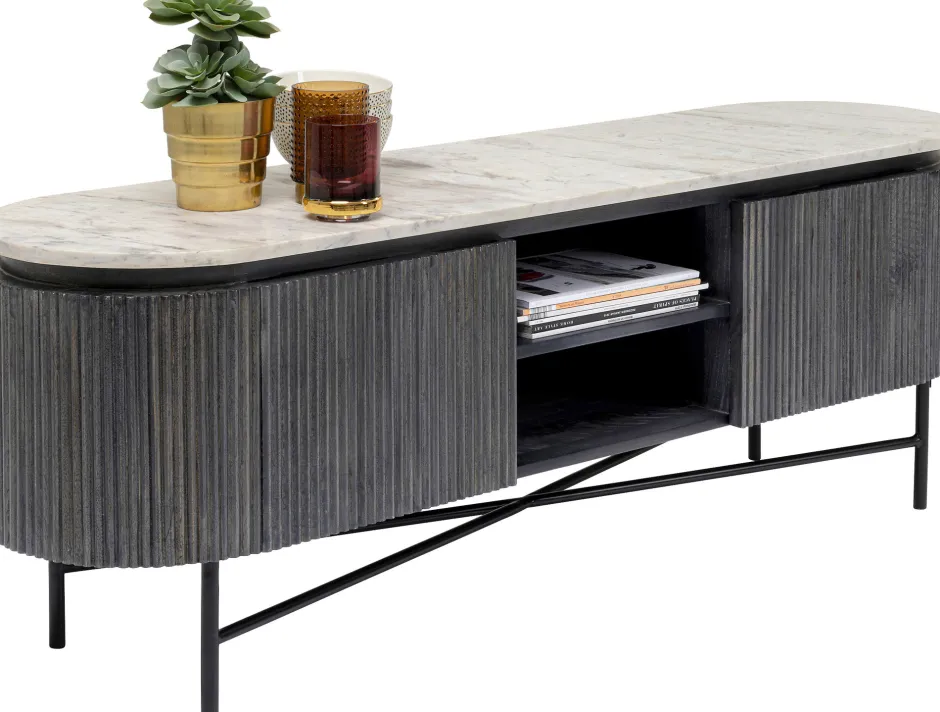 - Spielt mit dem Schwarz-Weiß-Kontrast: elegantes Sideboard mit heller Marmorplatte, dunkelgrauem Massivholz-Korpus auf filigranem Stahlgestell in Schwarz