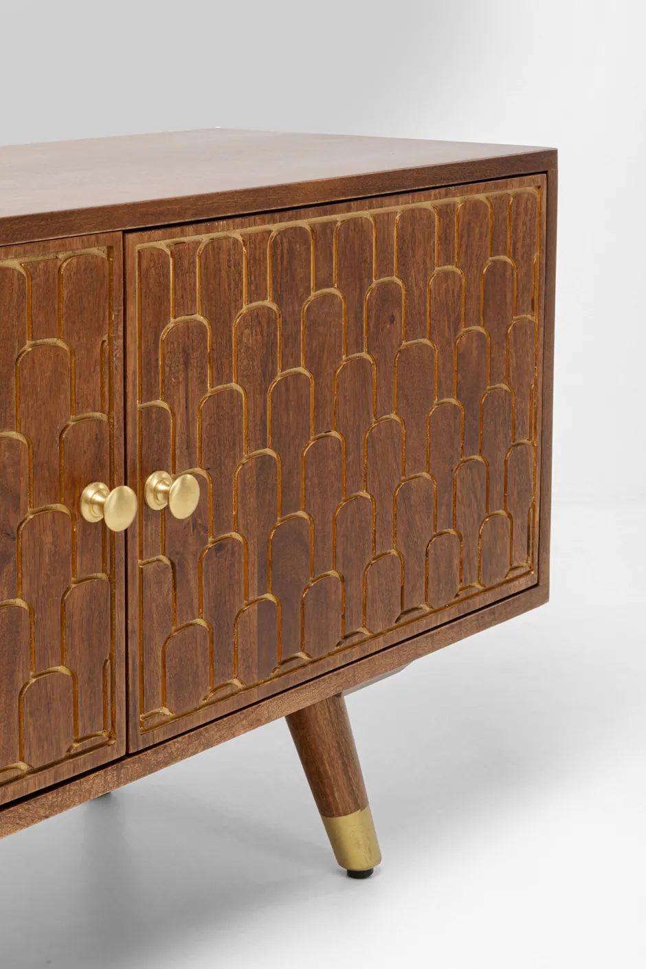 - Handgefertigtes, kompaktes TV-Board aus Mango-Massivholz mit eingravierten, orientalischen Gold-Verzierungen, zwei Türen und vier Ablagemöglichkeiten