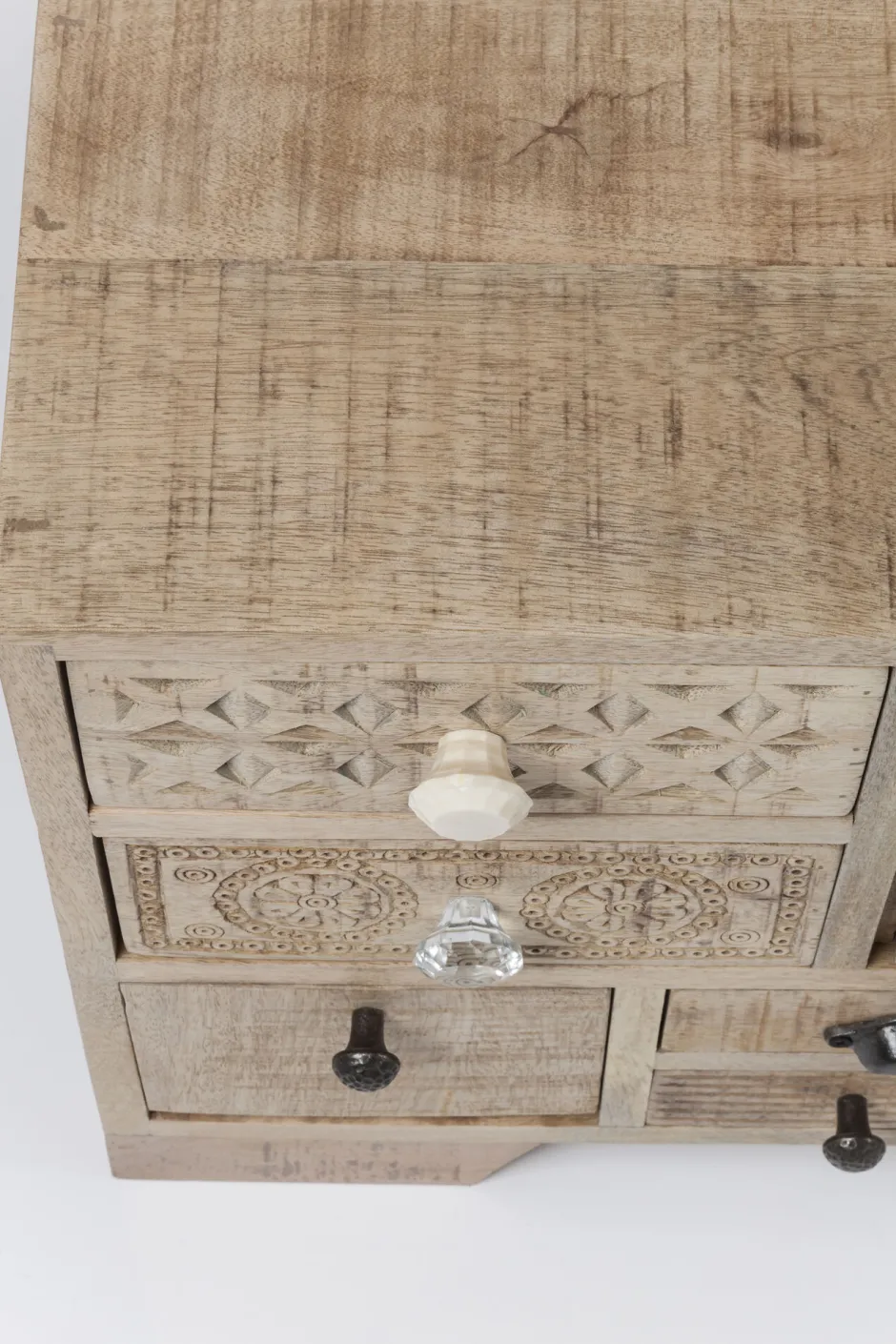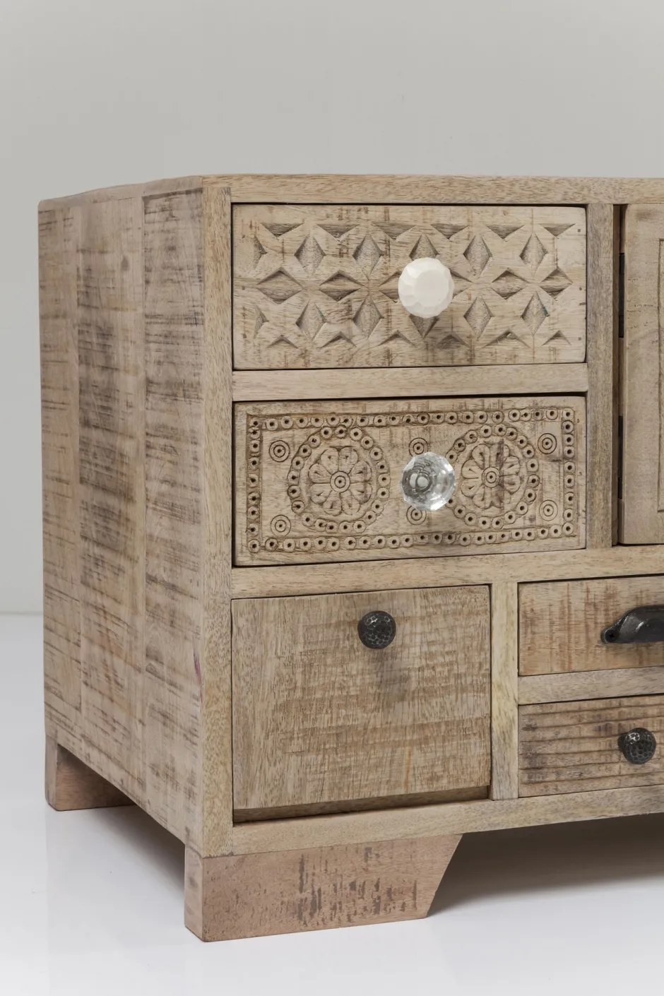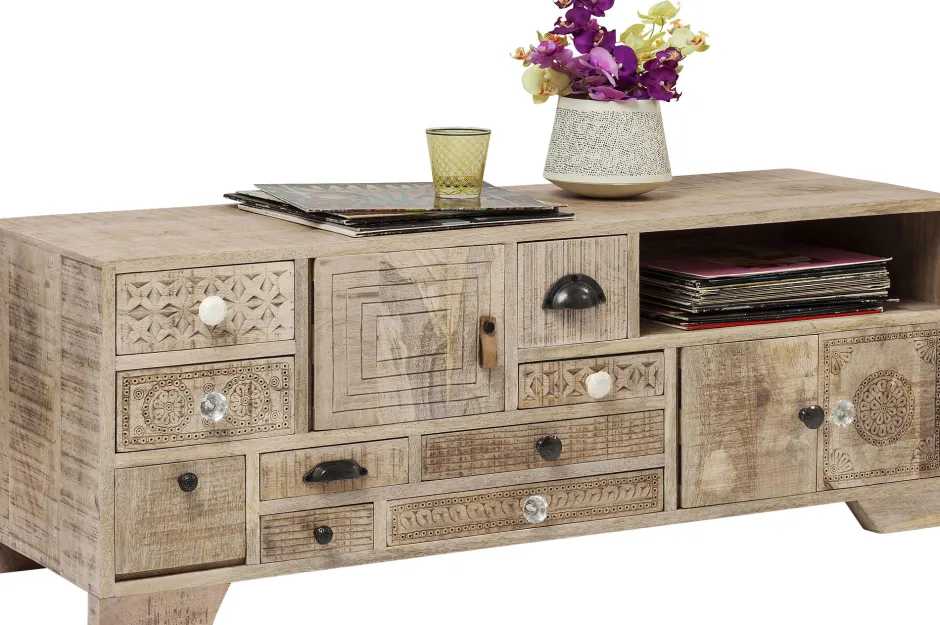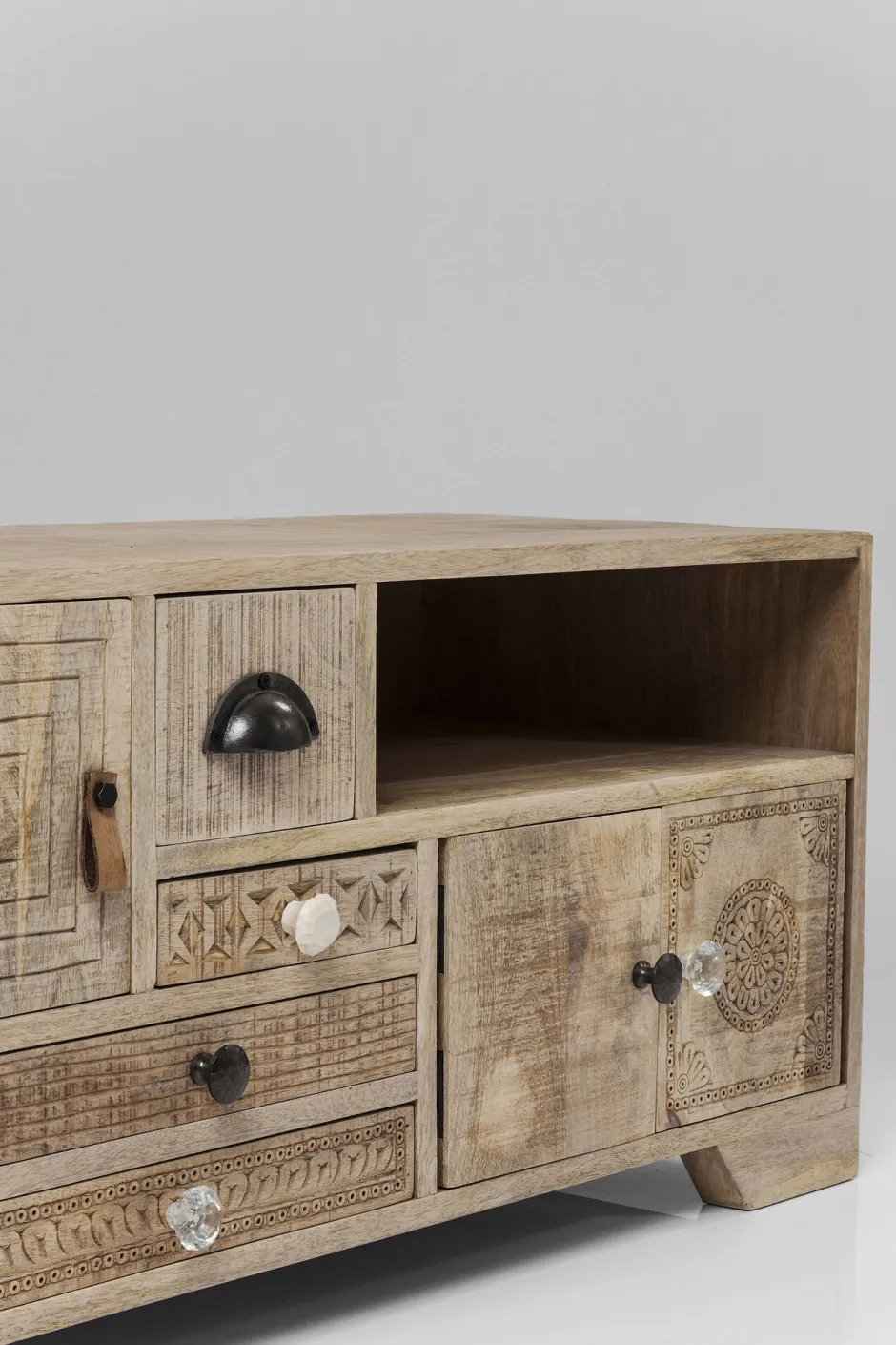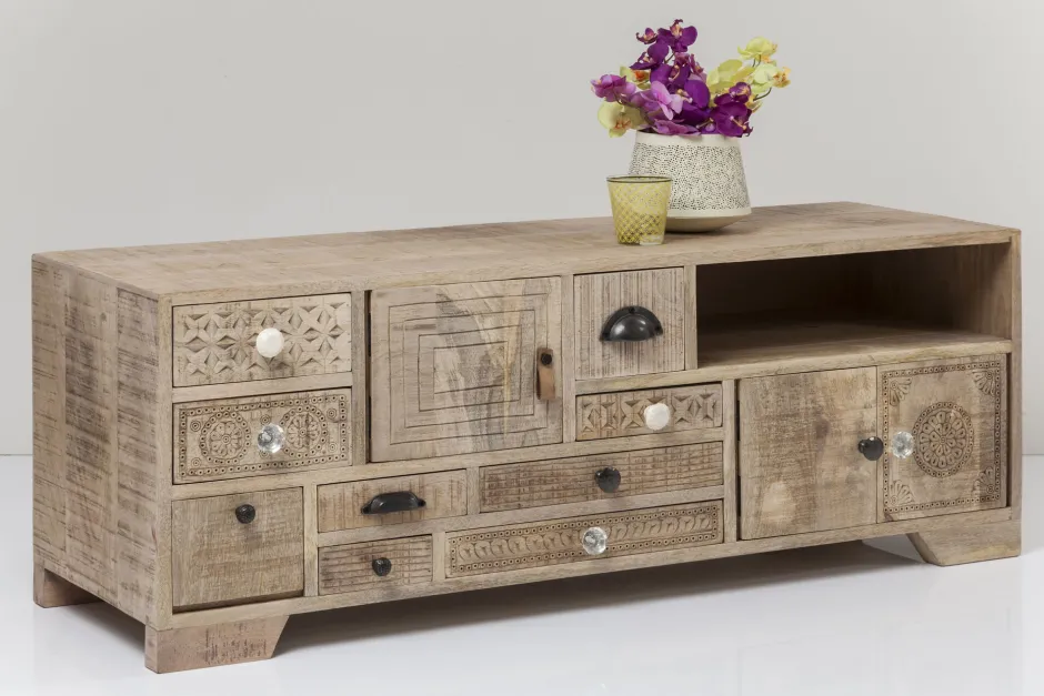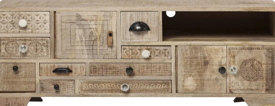 - Handgefertigtes TV-Board aus Mango-Massivholz mit neun Schüben, drei Türen mit einem Boden dahinter, einem offenen Boden und Kabeldurchlass hinten