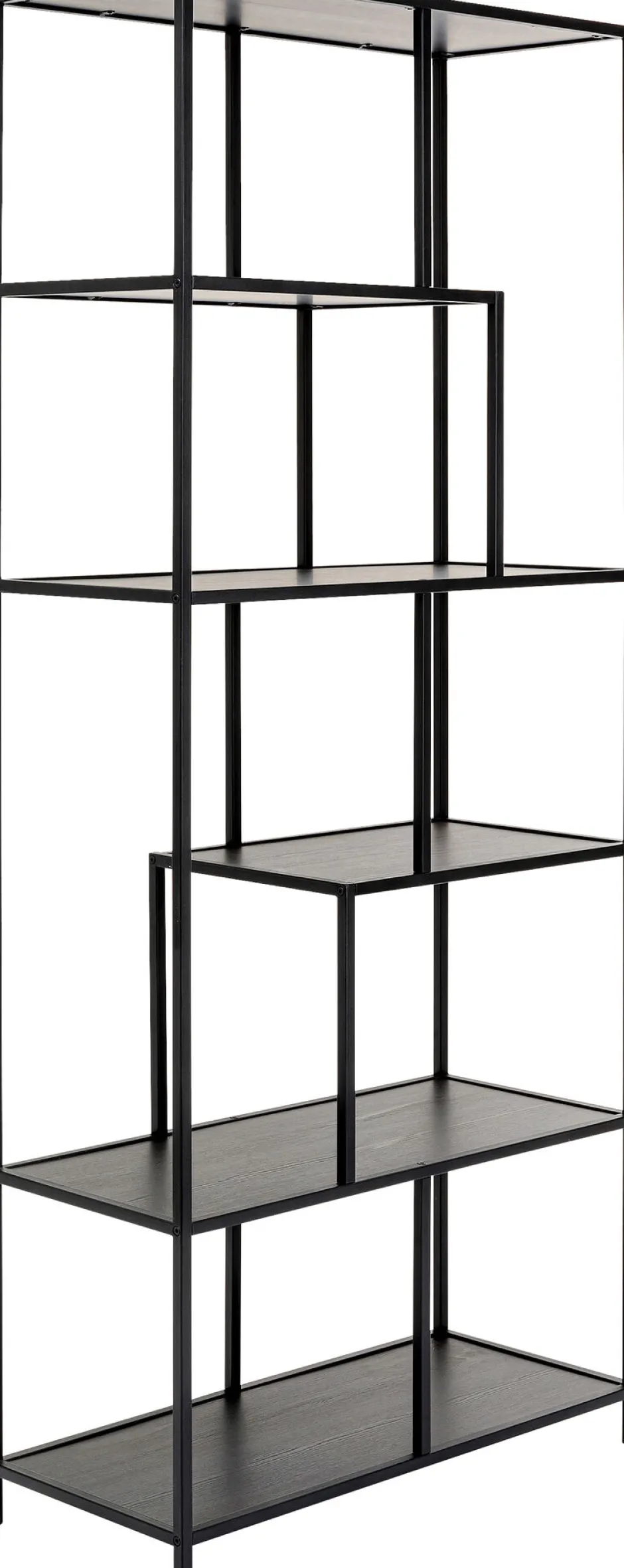 - Eleganz verleihen diesem Standregal die Böden mit schwarzem Eiche-Furnierholz