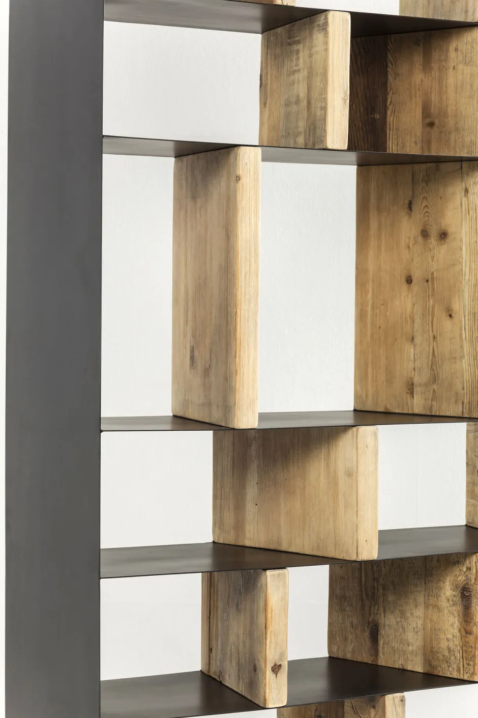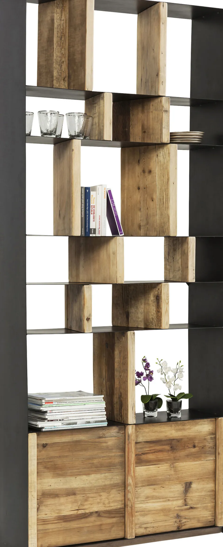 - Hohes Standregal mit einem Korpus und sechs Böden aus schwarz lackiertem Stahl und Elementen aus Kiefernmassivholz und zwei Türchen