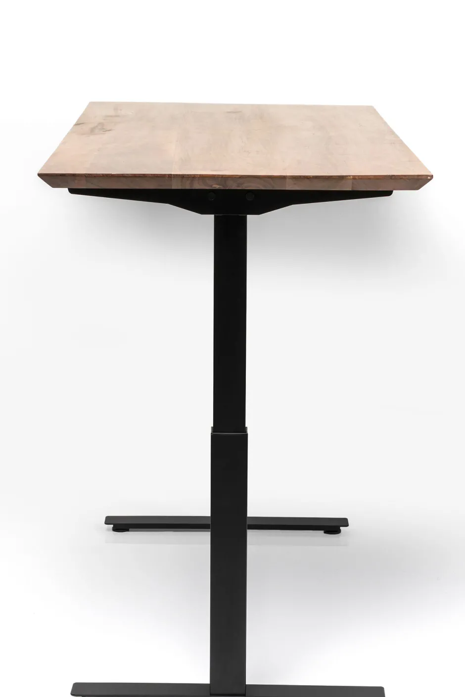 - Rechteckiger, elektrisch höhenverstellbarer Schreibtisch mit handgefertigter 3,5 cm starker Akazienholz-Platte und lackierten Stahl-Kufen in Schwarz