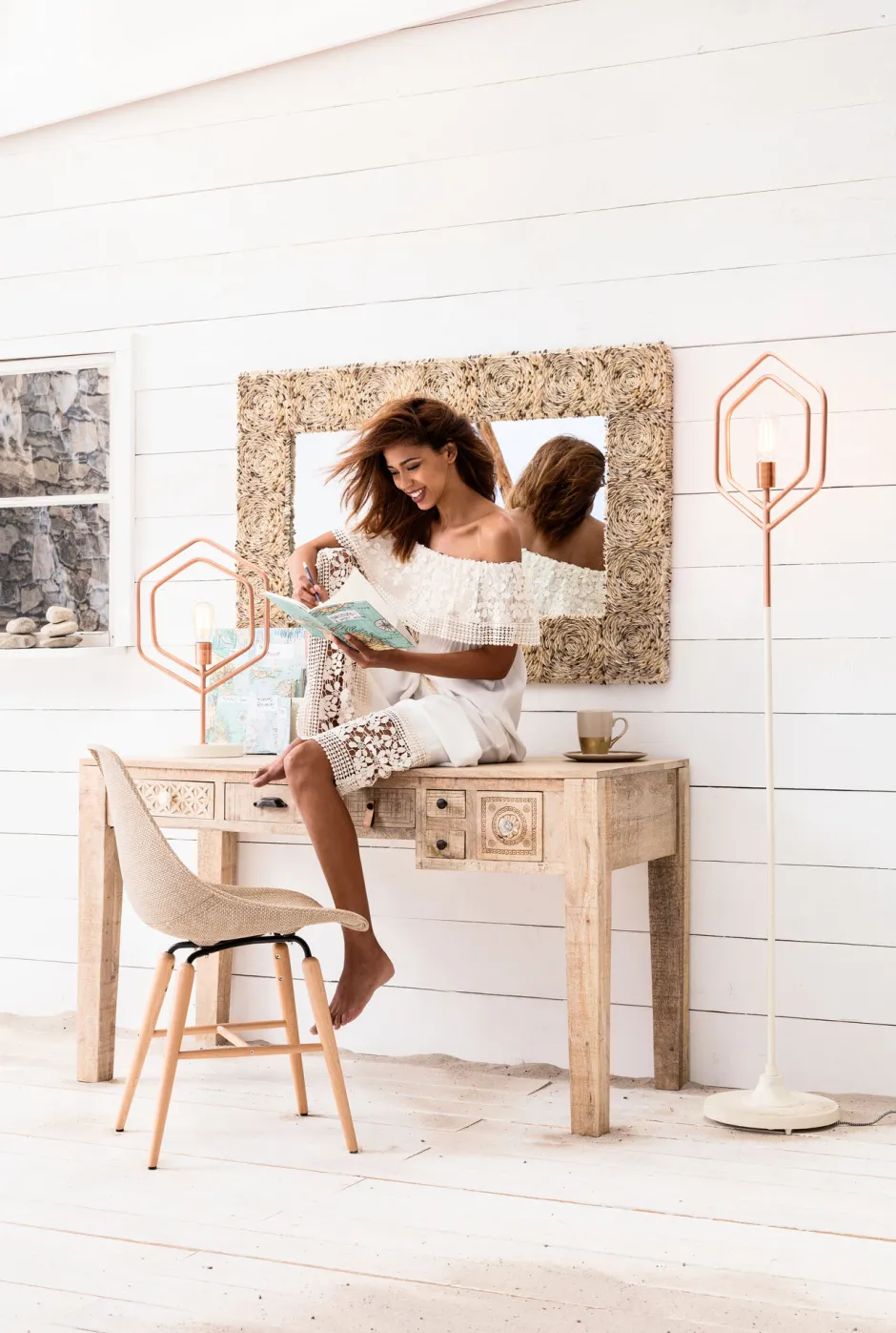 - Im Ethno-Look: handgefertigter Schreibtisch aus Mango-Echtholz mit geschnitzten Ornamenten und sechs individuellen Schüben