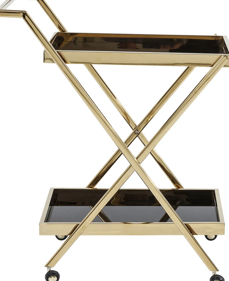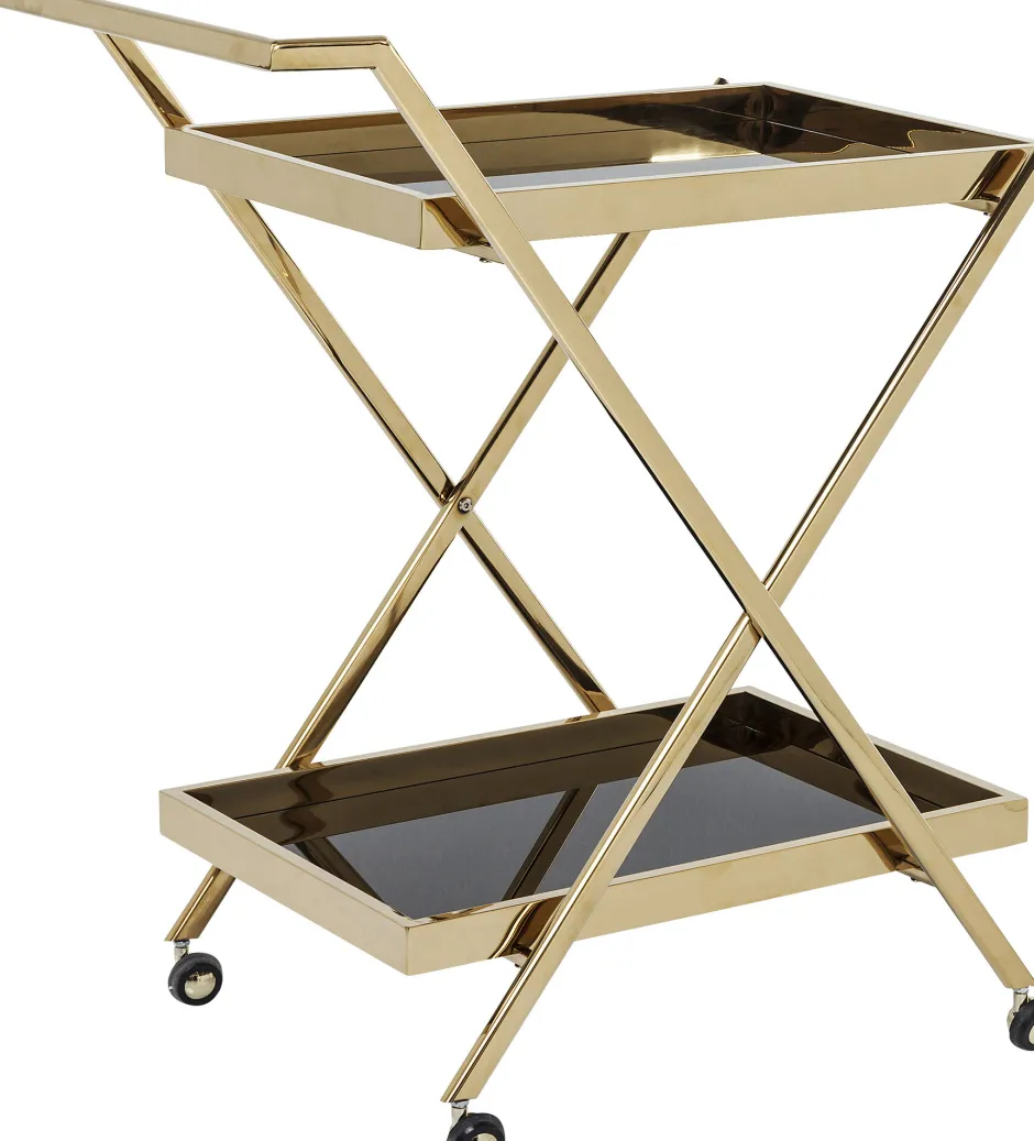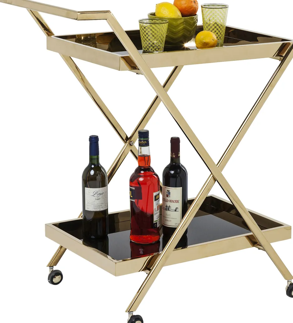- Eleganter, goldener Barwagen im Retro-Design, mit Rollen, Stahl-Gestell und zwei schwarzen Glas-Ablagen