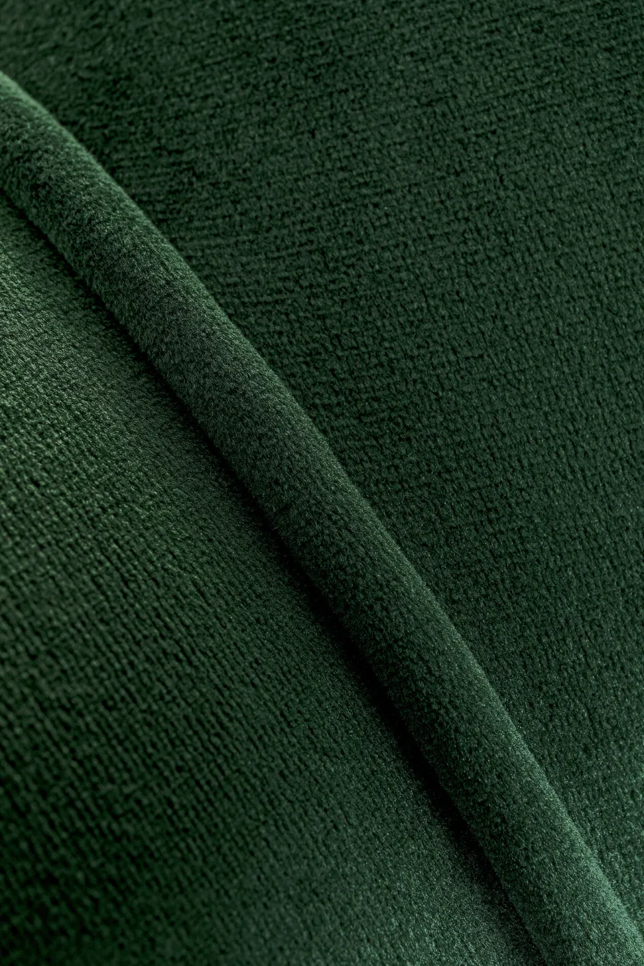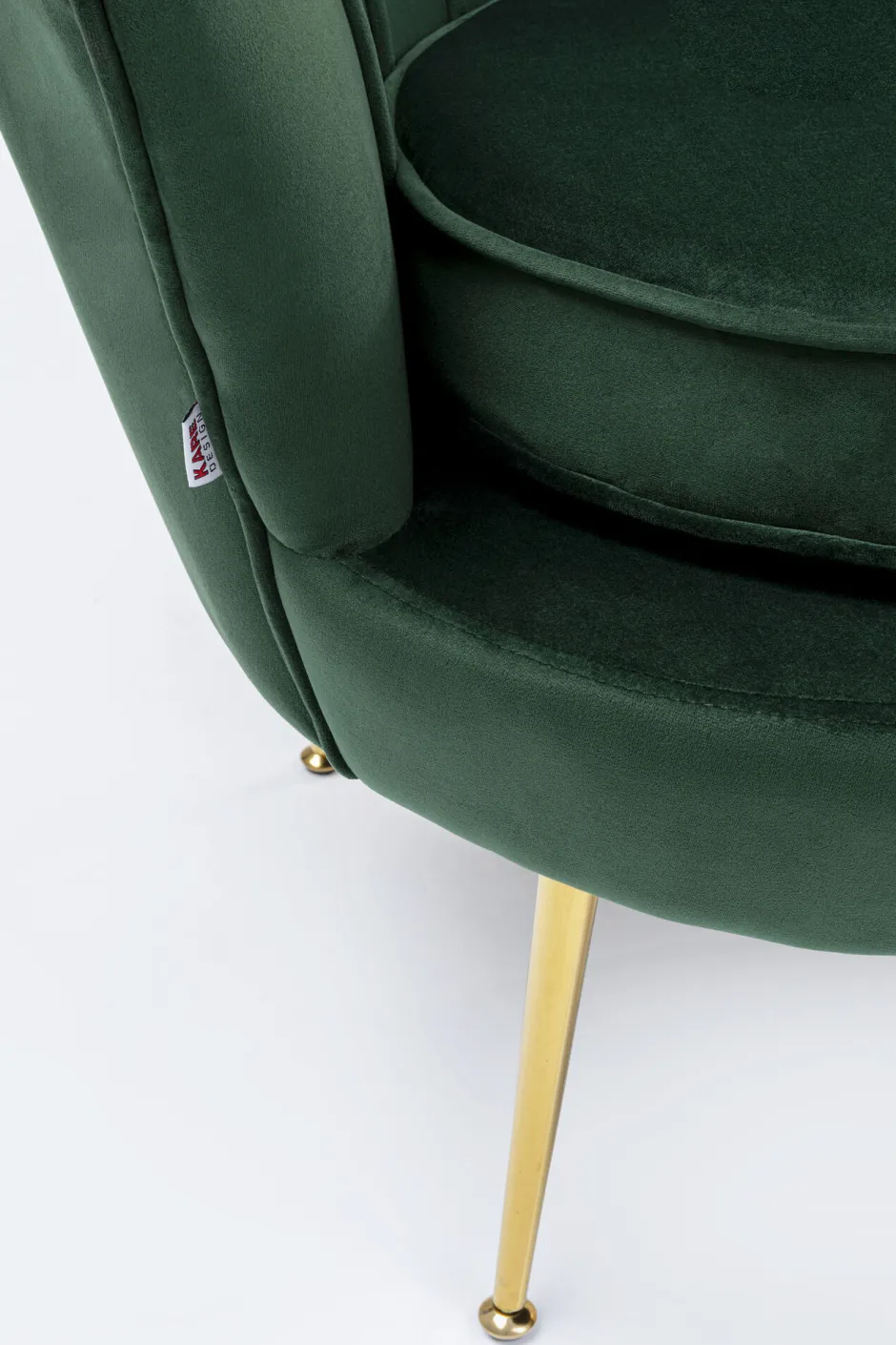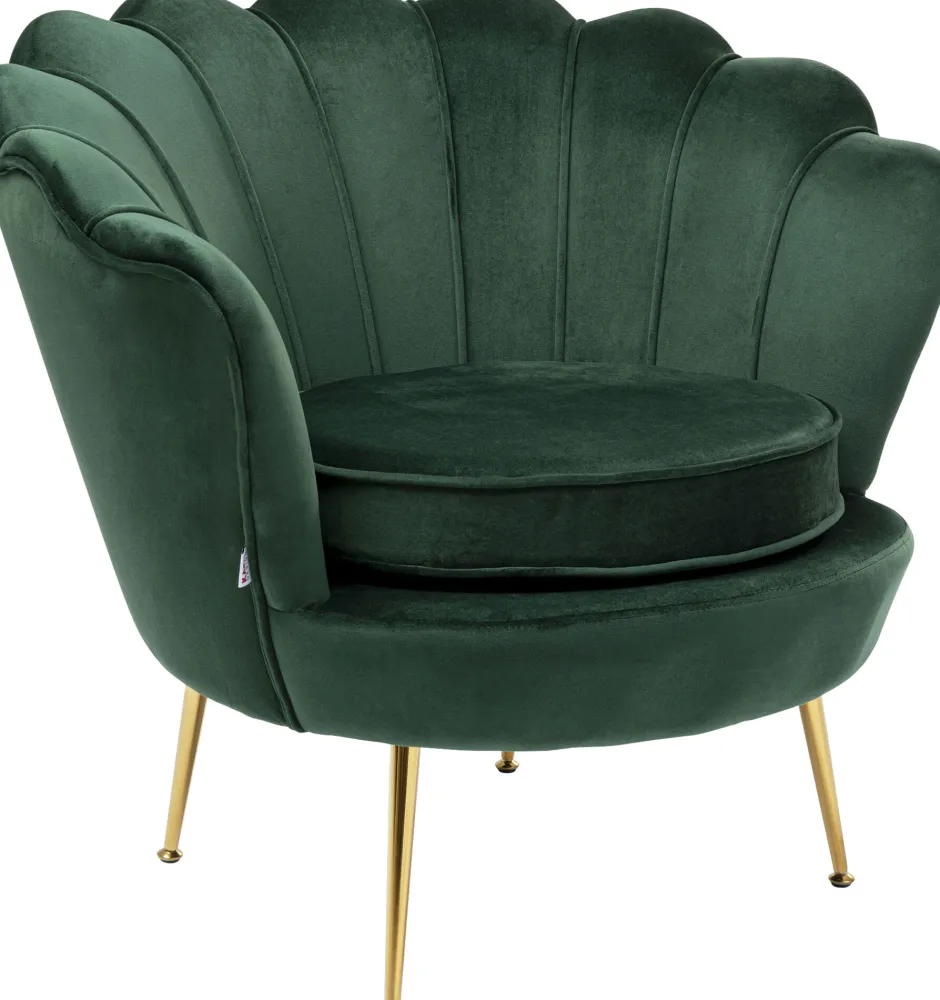 - Von der Form eines zarten Blütenkelches inspiriert: In herrlichem Tannengrün schimmert dieser samtige Cocktail-Sessel auf messingfarbenen Beinen