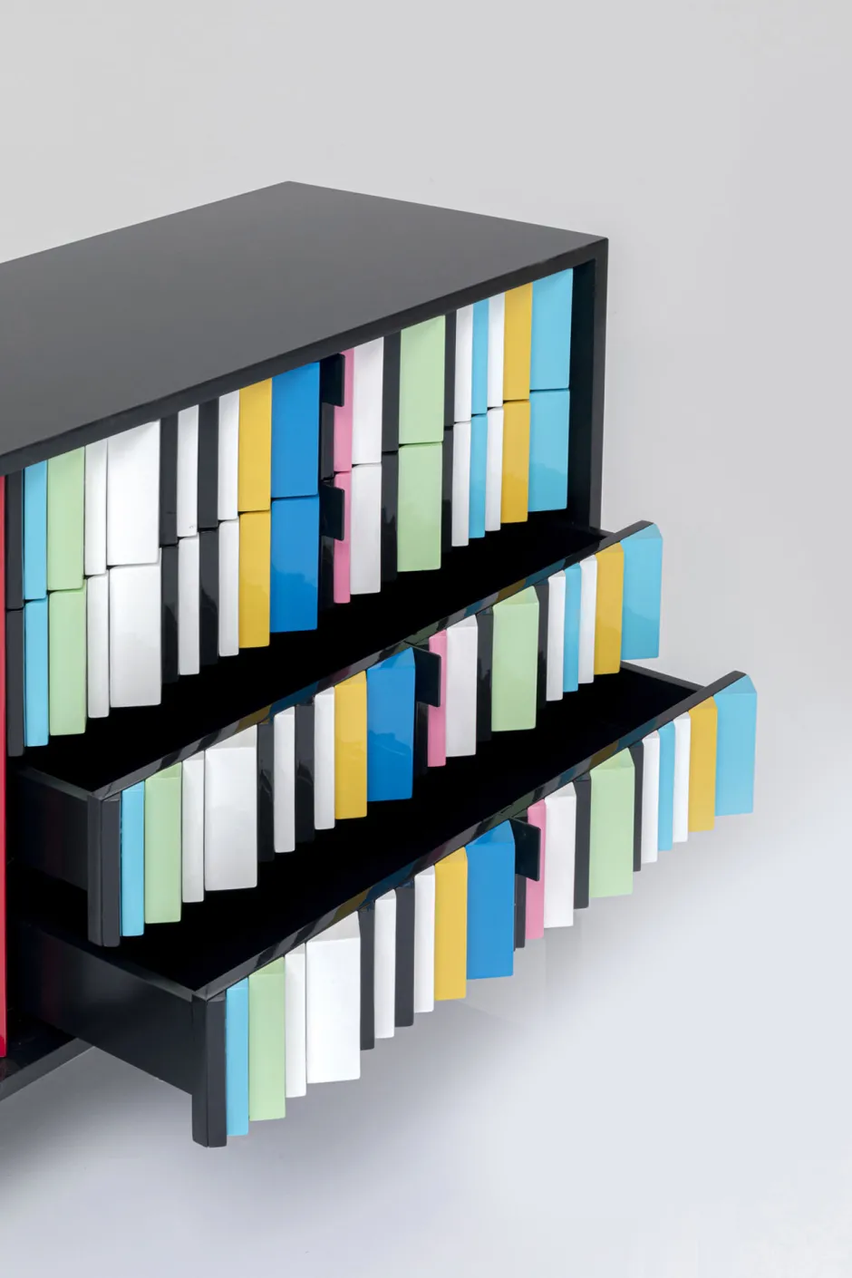 - Außergewöhnliches Sideboard mit schwarzem Korpus und bunter, dreidimensionaler Front, 74x186x40cm (H/B/T)