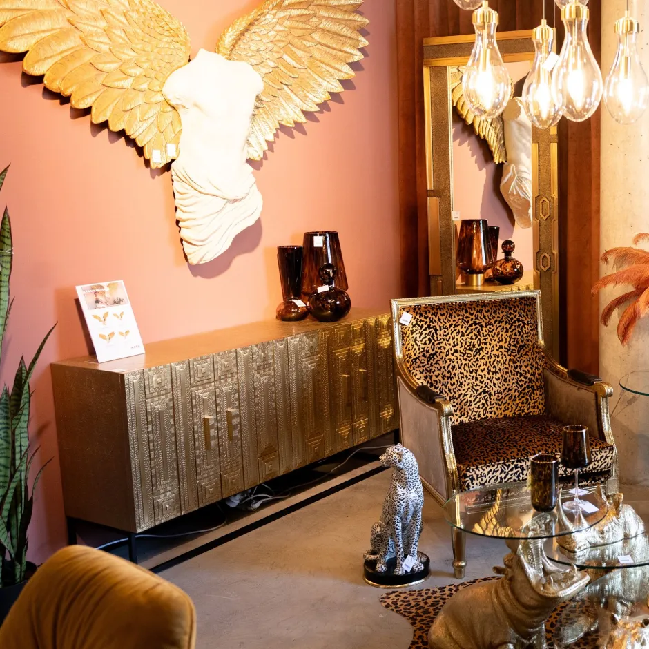 - Einzigartiges Design: Die mit Messing beschichteten Schranktüren in Kombination mit den schwarzen Füßen wirken besonders glamourös