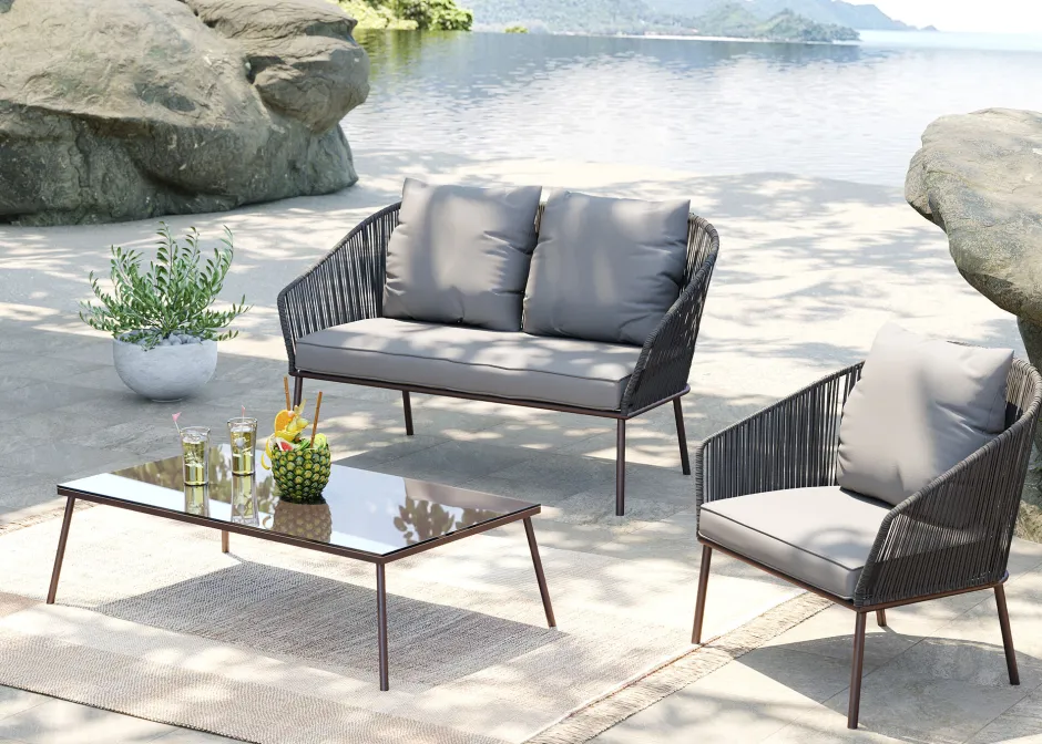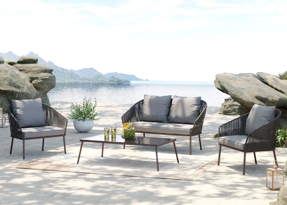 - Outdoor Sitzgruppe in Grau, vierteilig mit Dreisitzer-Sofa, zwei Sesseln, Kissen und rechteckigem Couchtisch