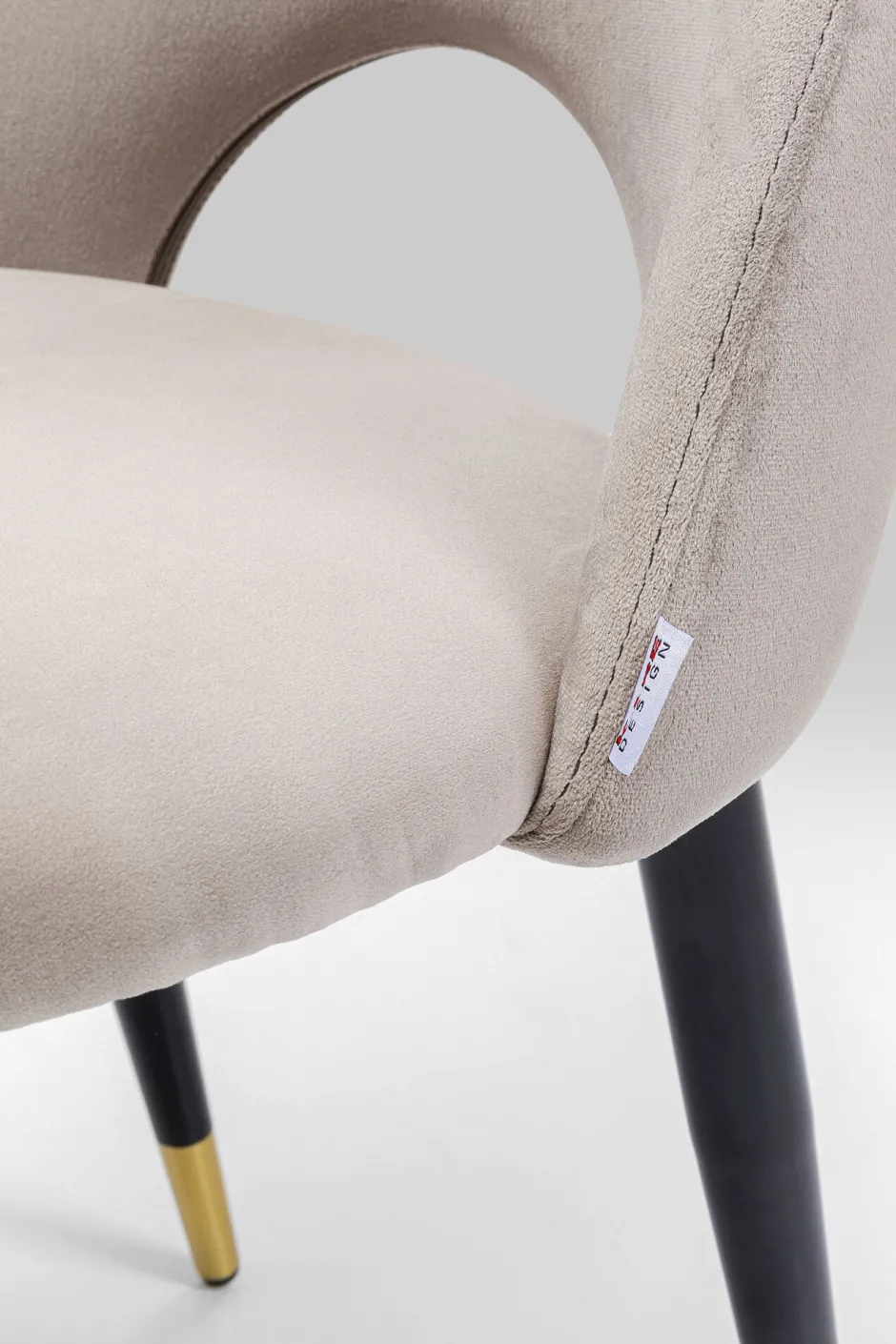 - Blickfänger mit Grandezza: Polsterstuhl mit schwarz lackierten Beinen und einem samtigen Bezug in der klassischen Farbe Beige