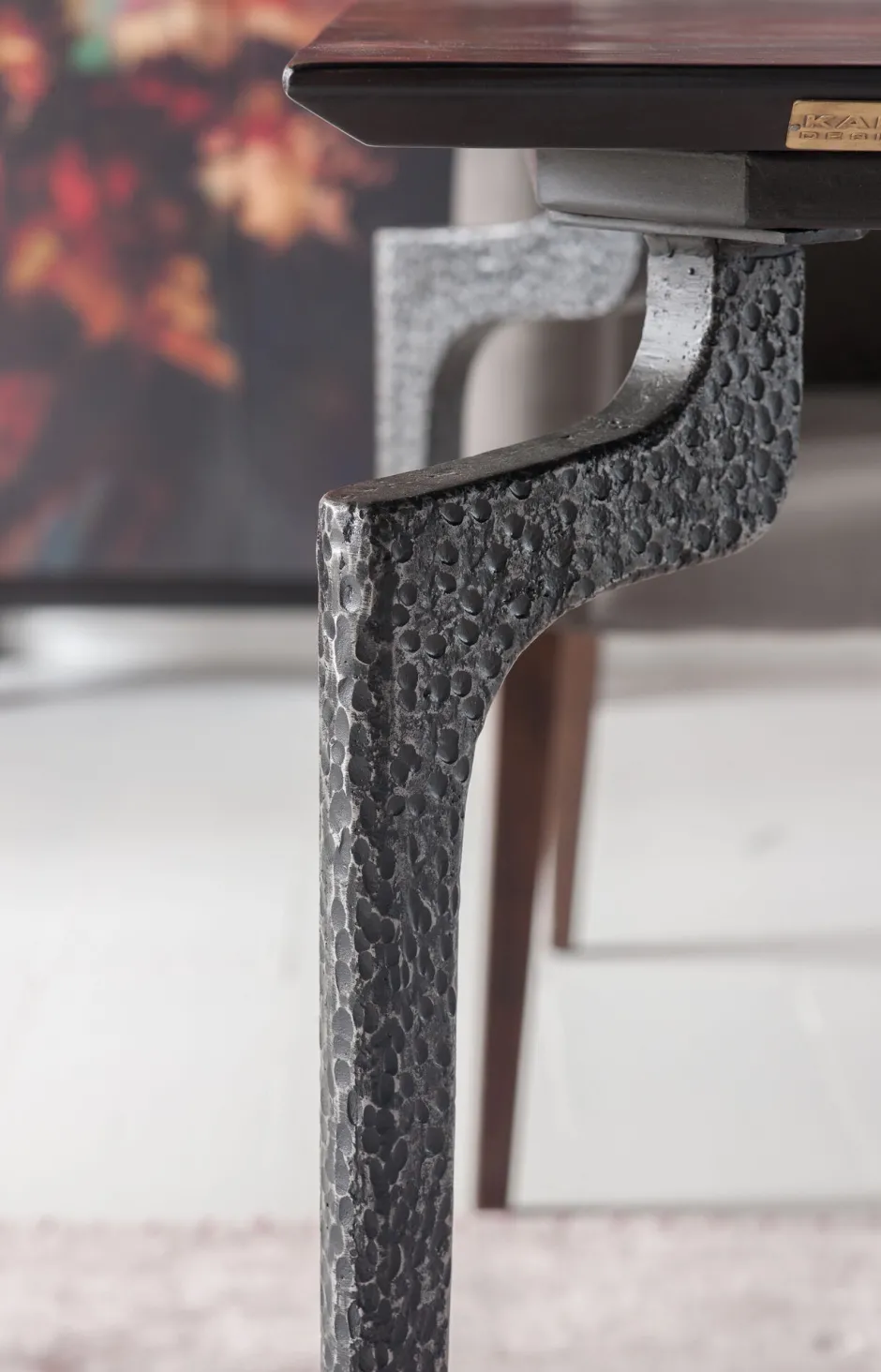 - Einzigartig: Die raffiniert geformten, gehämmerten Stahl-Beine und die schrägen Tisch-Kanten