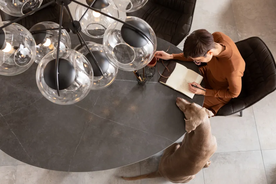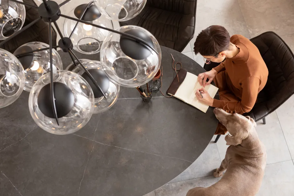 - Noble Tischplatte aus dunkler Keramik, Maserung und Optik erinnern an Naturstein