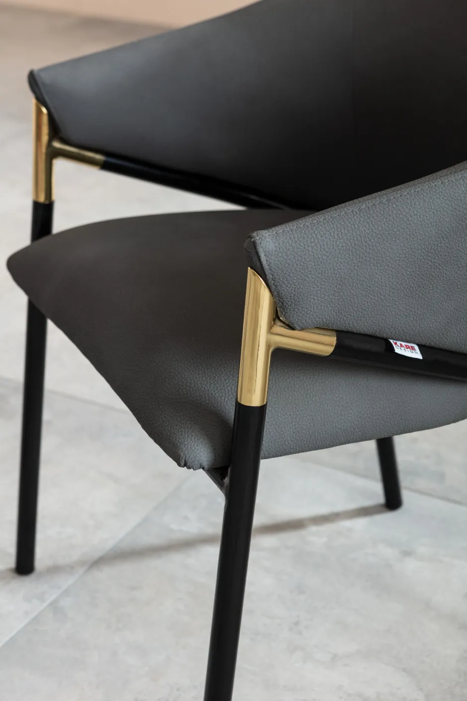 - Klassischer Stuhl mit gerundeter Rücken- und Armlehne in eleganter Formensprache, in Grau und Schwarz mit messingfarbenem Akzent