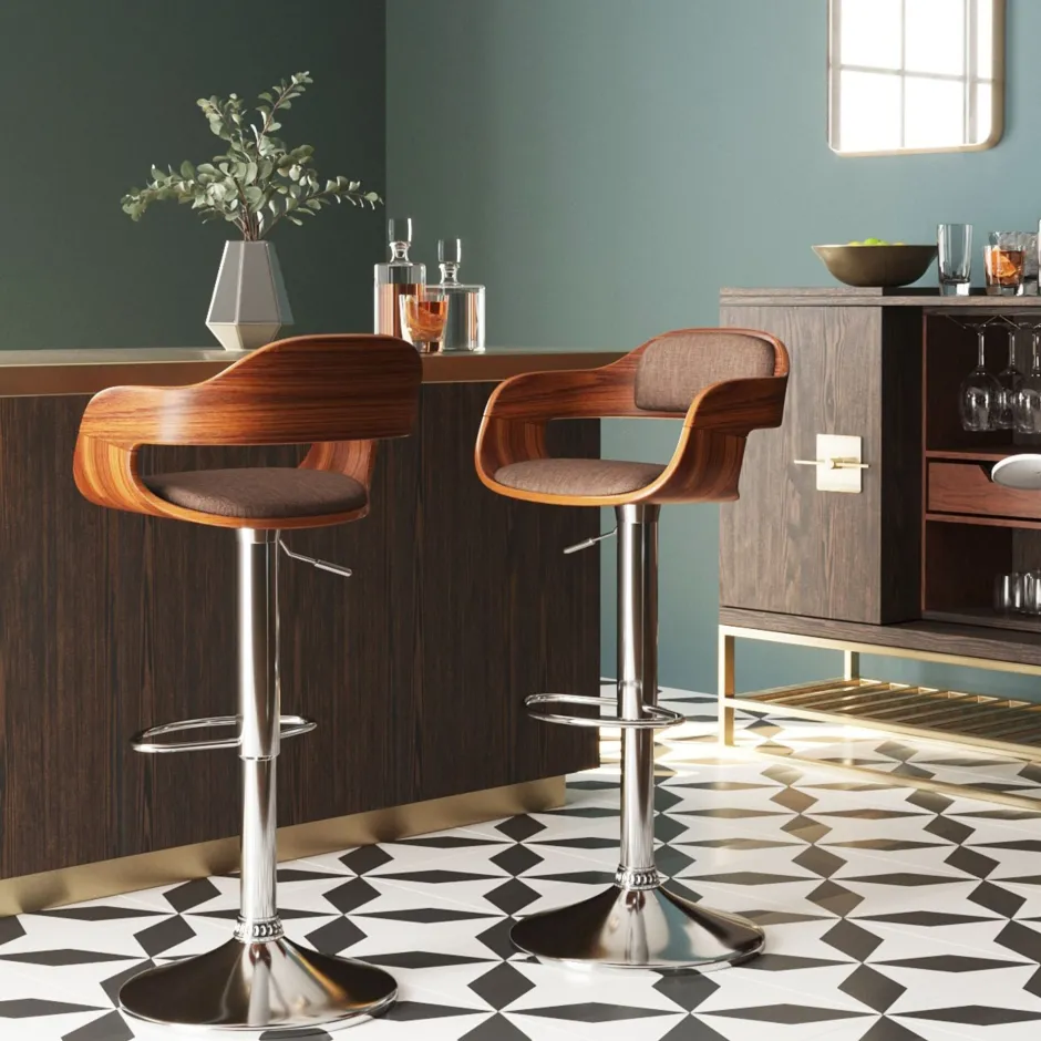 - Höhenverstellbarer Barhocker mit rundem, chromfarbenem Stahl-Fuß, schokobraunem Stoffbezug und einer Fußstütze