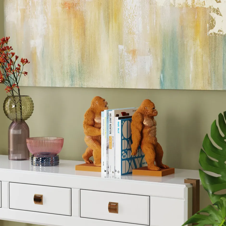 - Set aus zwei Buchstützen in Form von Gorillas in Orange mit goldfarbenen Details