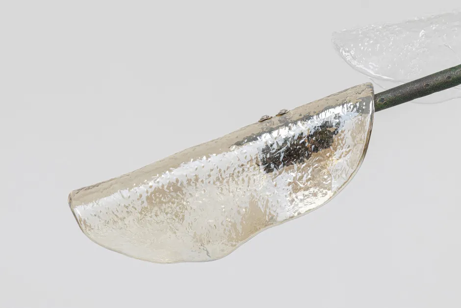 - 6 unterschiedlich gefärbte Glasschirme schmiegen sich wie Blütenblätter an das lackierte Stahlgestell