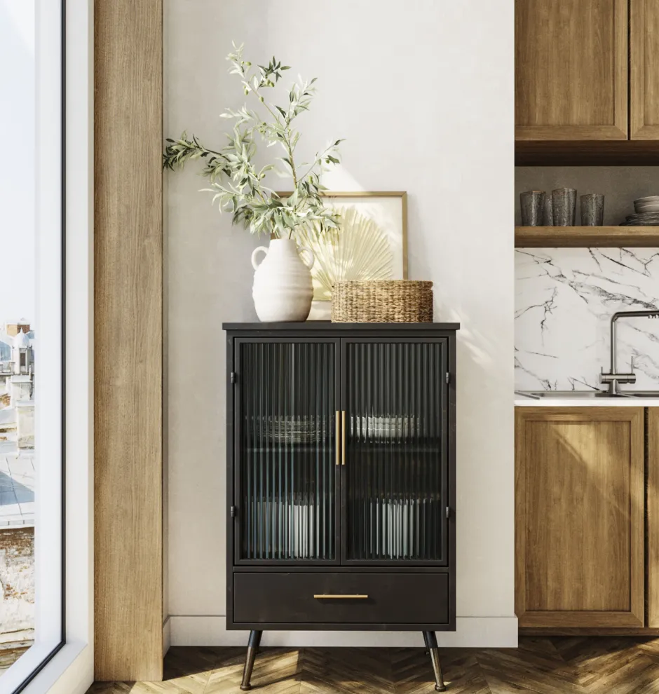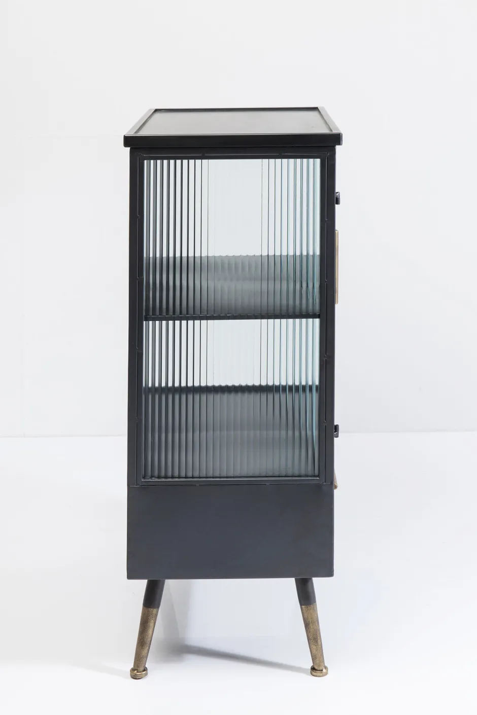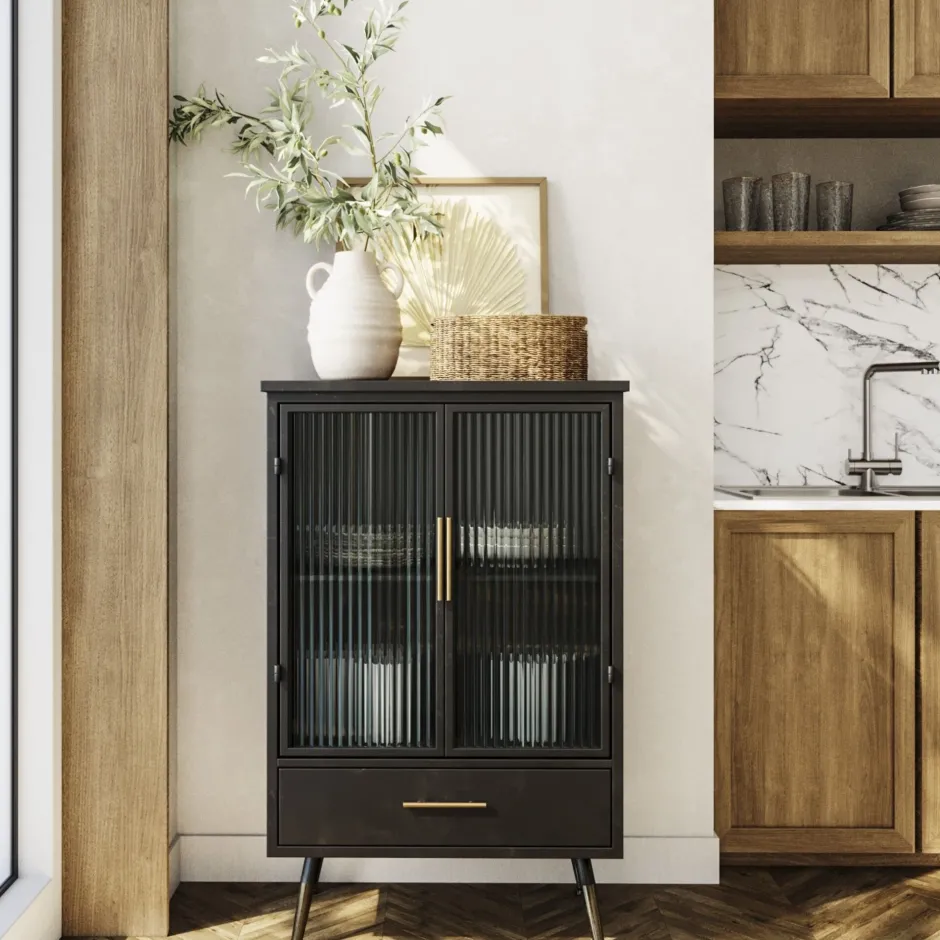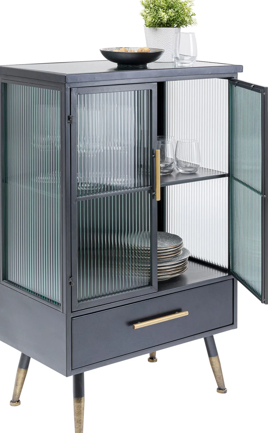 - Praktische und schicke Kommoden-Vitrine in Schwarz im lässigen Understatement-Look – für Küche, Bad, Arbeits- oder Wohnzimmer