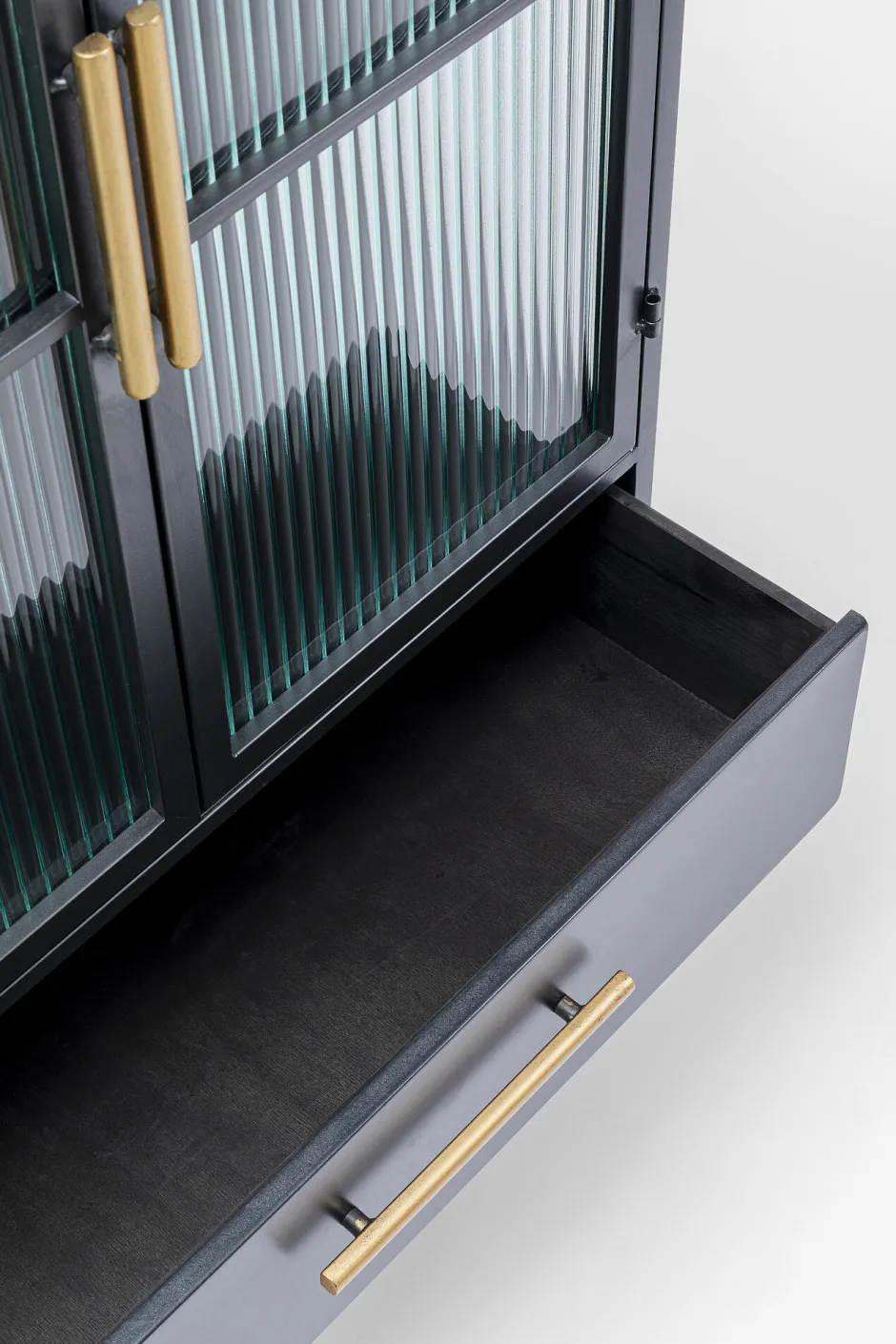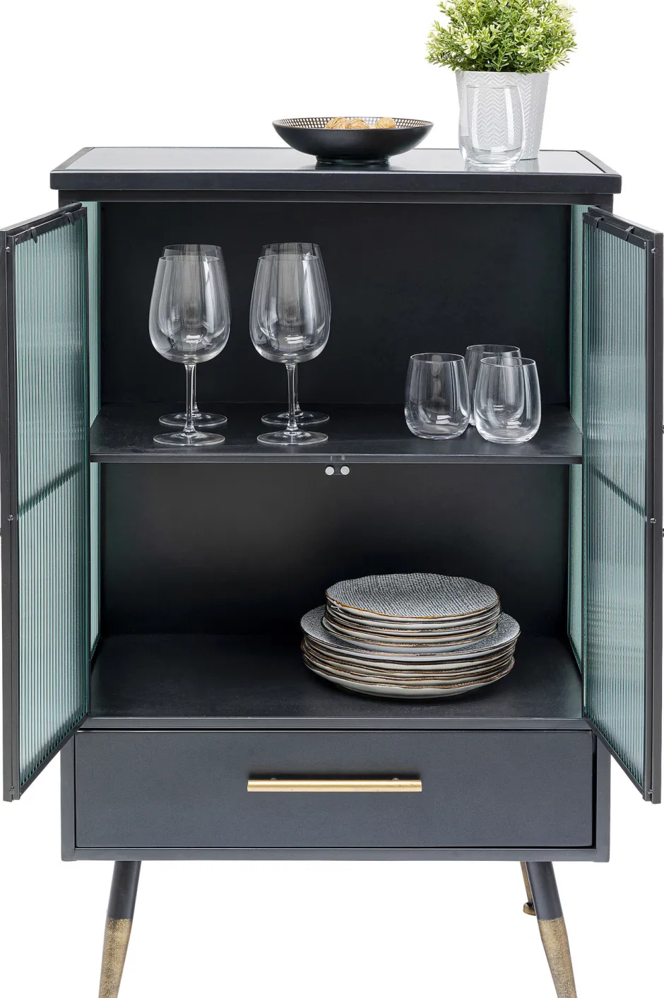 - Ein kleines Stauraum-Wunder – mit einer Schublade und zwei Ablageflächen hinter den halbtransparenten Glastüren
