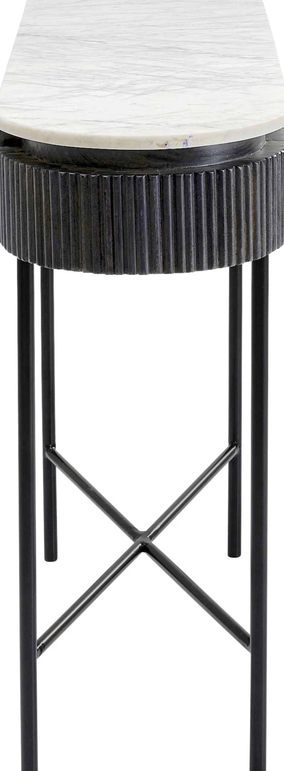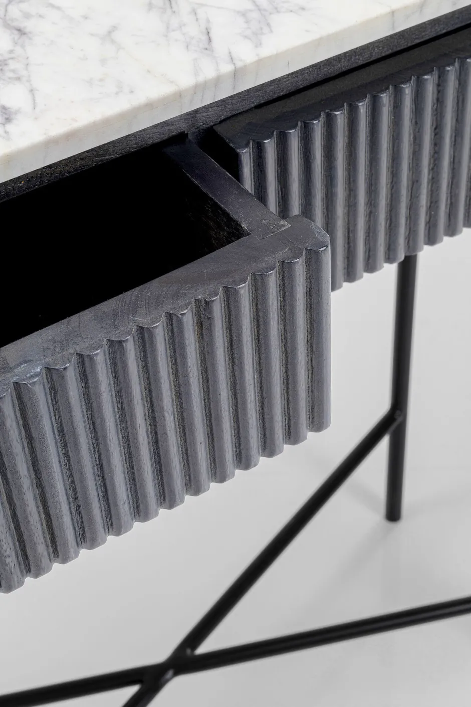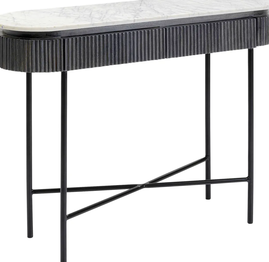 - Spielt mit dem Schwarz-Weiß-Kontrast: elegante Flurkonsole mit heller Marmorplatte und dunkelgrauem Massivholz-Korpus auf filigranem Stahlgestell in Schwarz