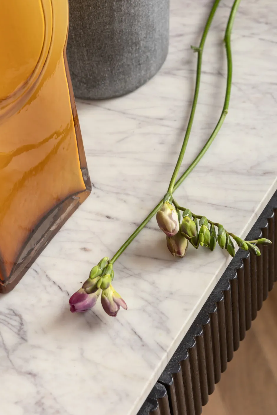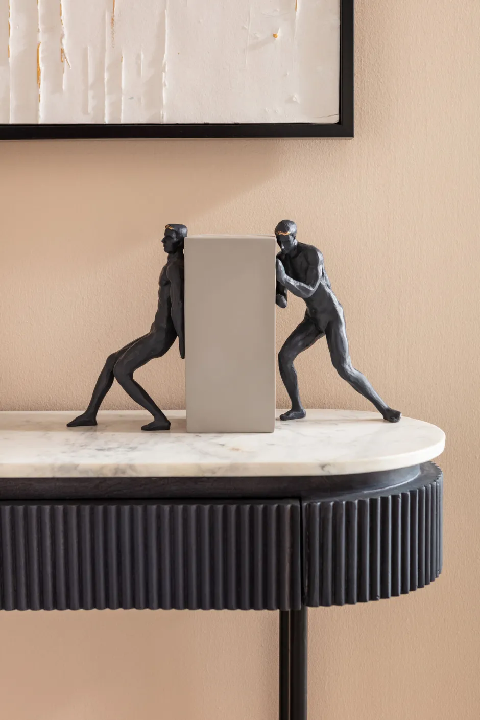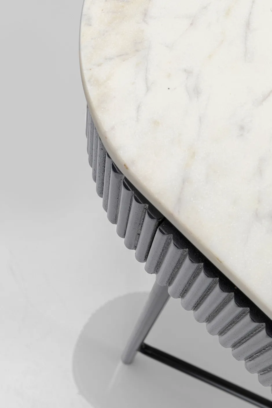 - Spielt mit dem Schwarz-Weiß-Kontrast: elegante Flurkonsole mit heller Marmorplatte und dunkelgrauem Massivholz-Korpus auf filigranem Stahlgestell in Schwarz