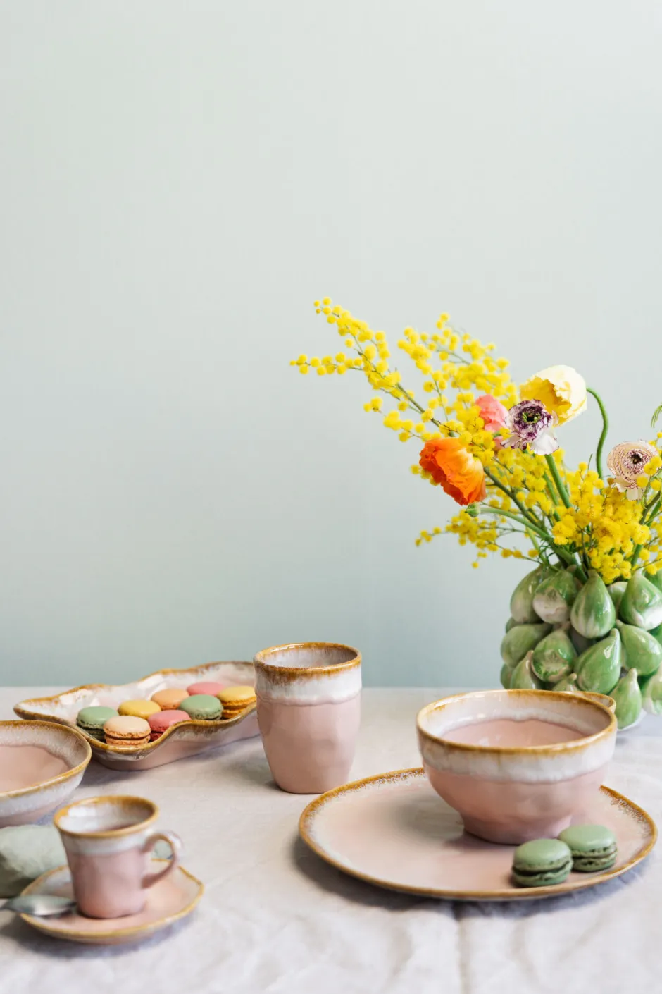 - Der zarte Rosa-Ton und sanfte Details in Weiß und warmem Beige schaffen einen harmonischen, mediterranen Look