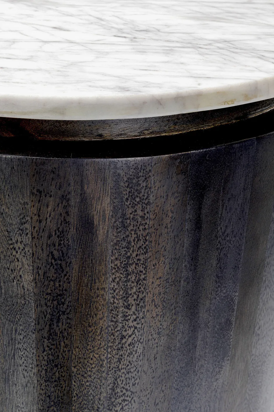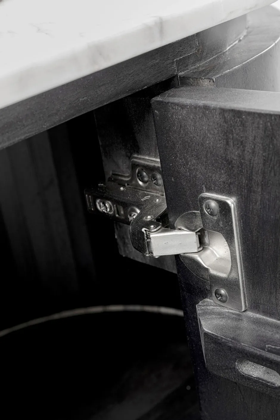 - Spielt mit dem Schwarz-Weiß-Kontrast: eleganter Schrank mit heller Marmorplatte, dunkelgrauem Massivholz-Korpus auf filigranem Stahlgestell in Schwarz