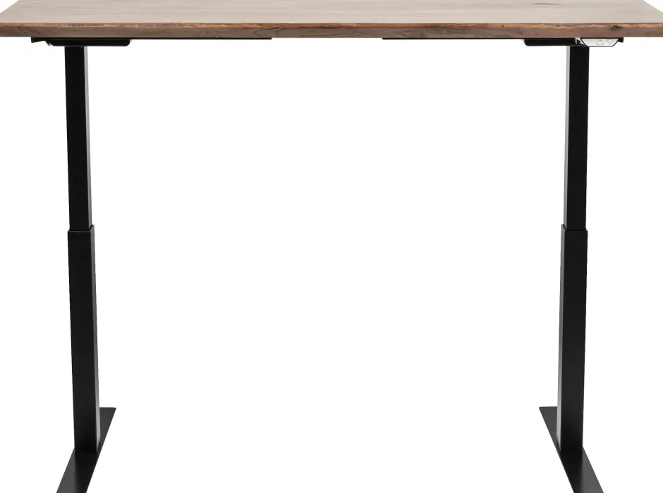 - Rechteckiger, elektrisch höhenverstellbarer Schreibtisch mit handgefertigter 3,5 cm starker Akazienholz-Platte und lackierten Stahl-Kufen in Schwarz
