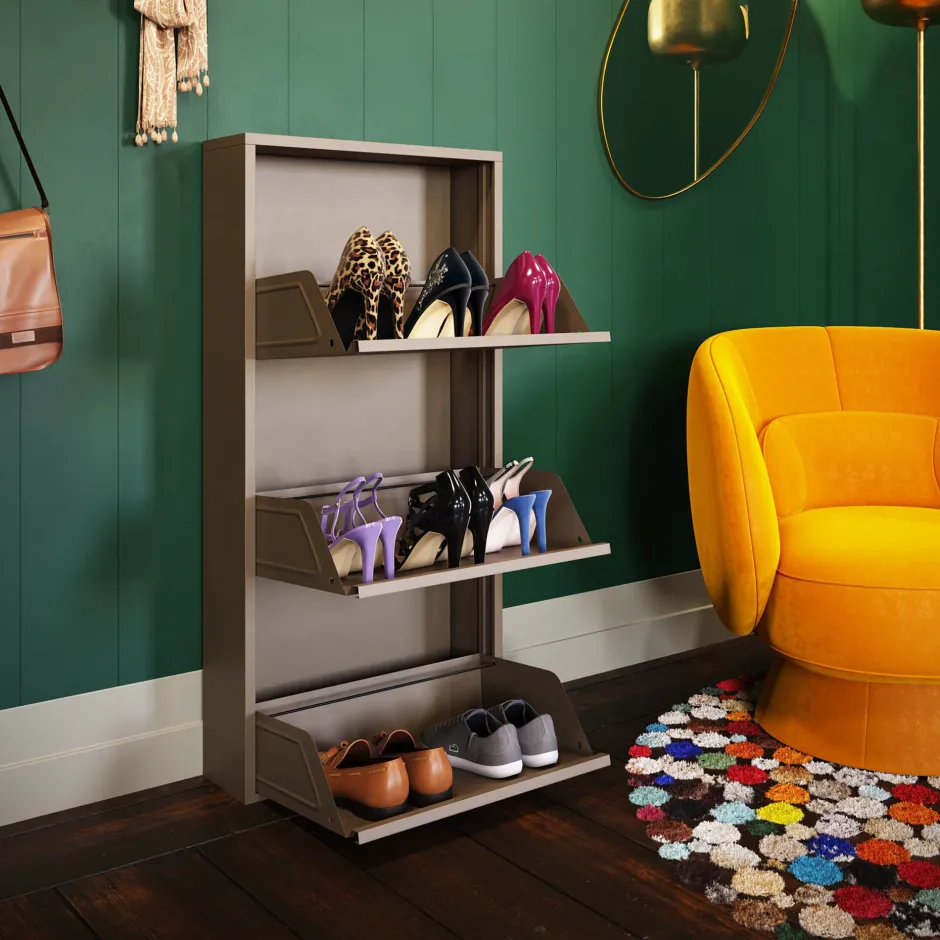 - Mit drei Kippfächern, die Schuhe vor Staub und Blicken schützen