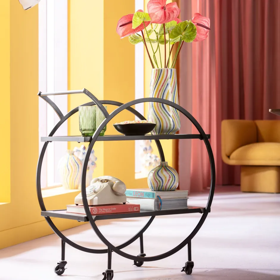 - Eleganter Servierwagen in Schwarz mit dunklen Glasplatten und einem Hauch Retro-Design