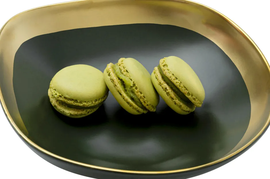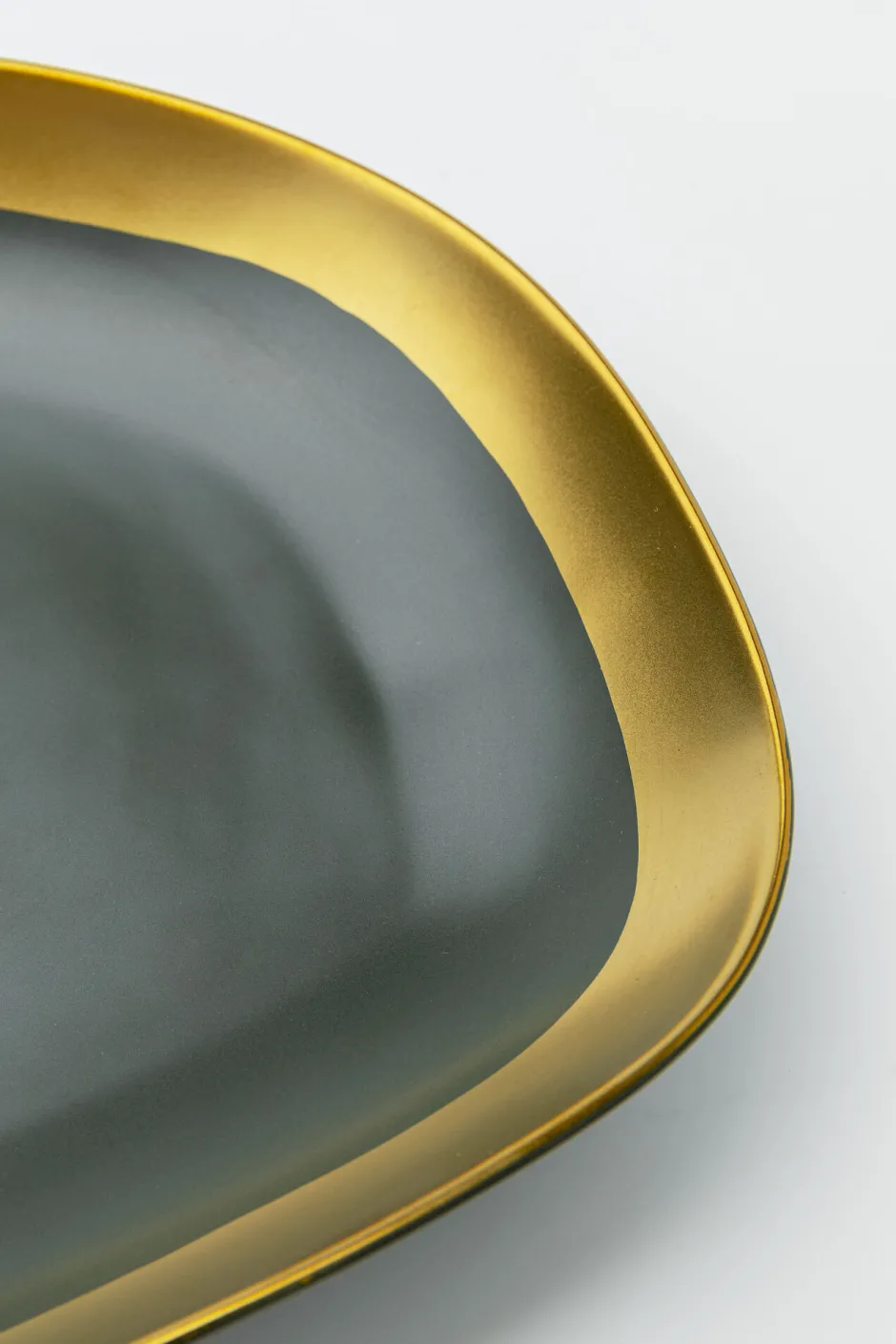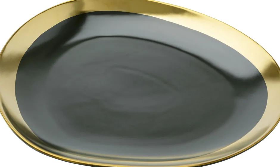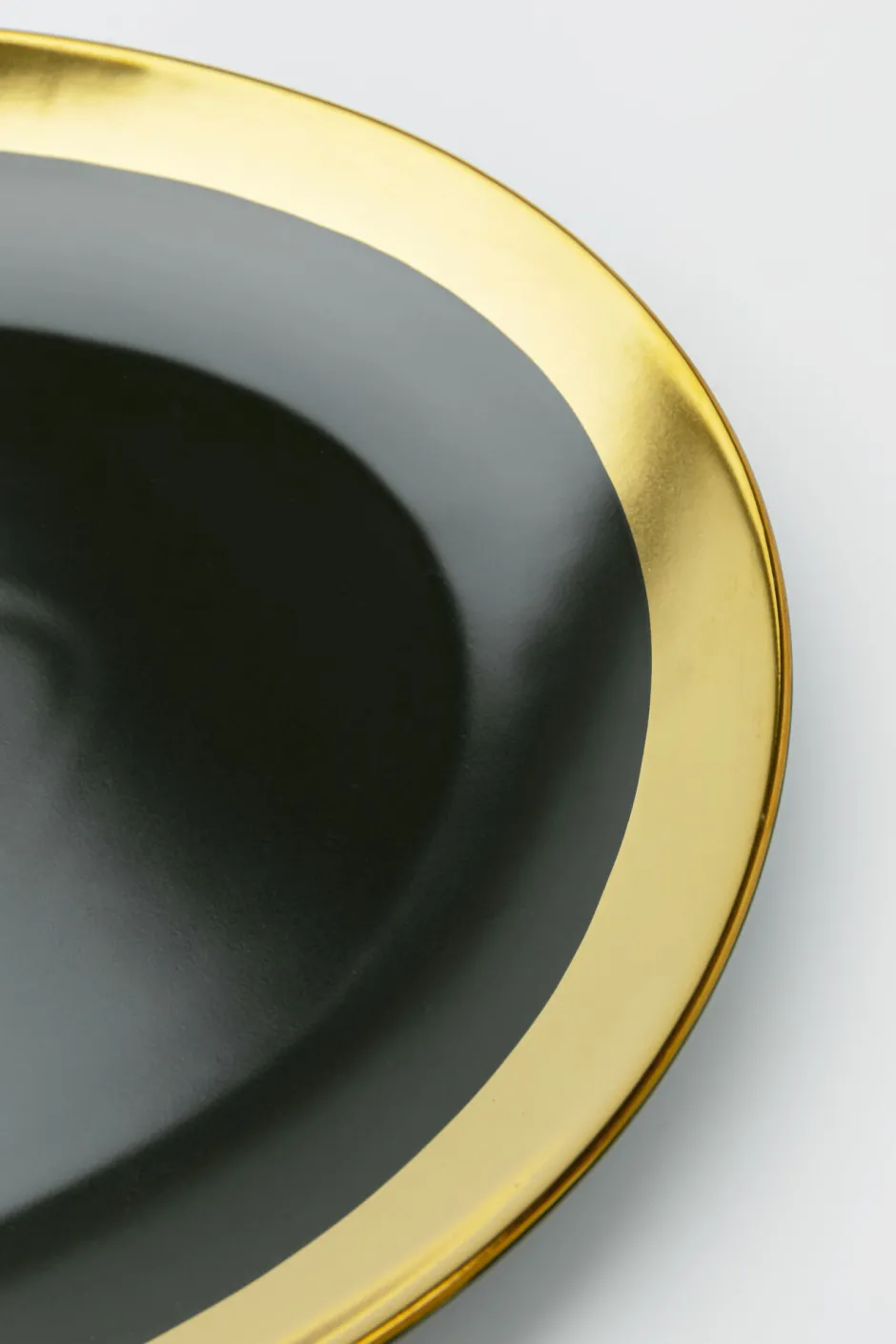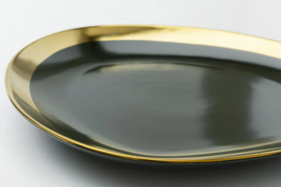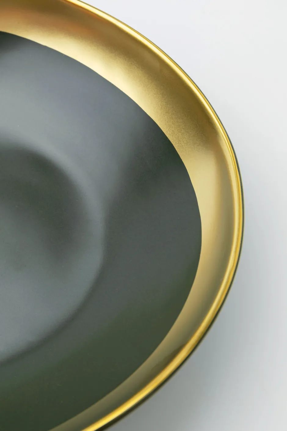 - Edle, von Hand aus Keramik hergestellte Geschirrserie in einem sehr dunklen Grün mit mattem Goldrand