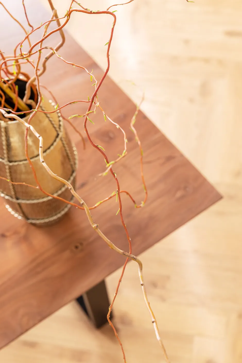- Der natürliche Wuchs des Baumes spiegelt sich in den unregelmäßig geformten Längsseiten des Tisches wider und macht jeden Tisch zum Unikat