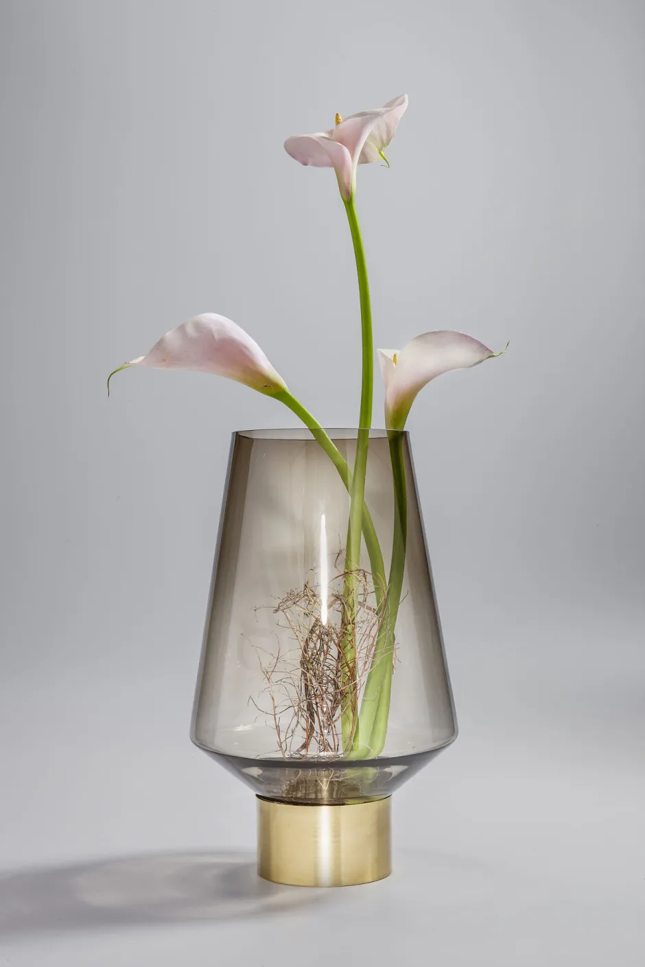 - Wunderschöne rauchige Glasvase in einem rauchigen Braun mit einem messingverzierten Sockel: Solche Details sorgen für Chic